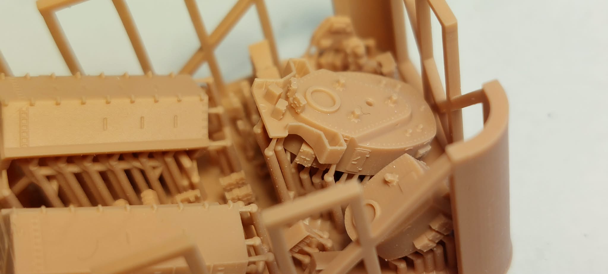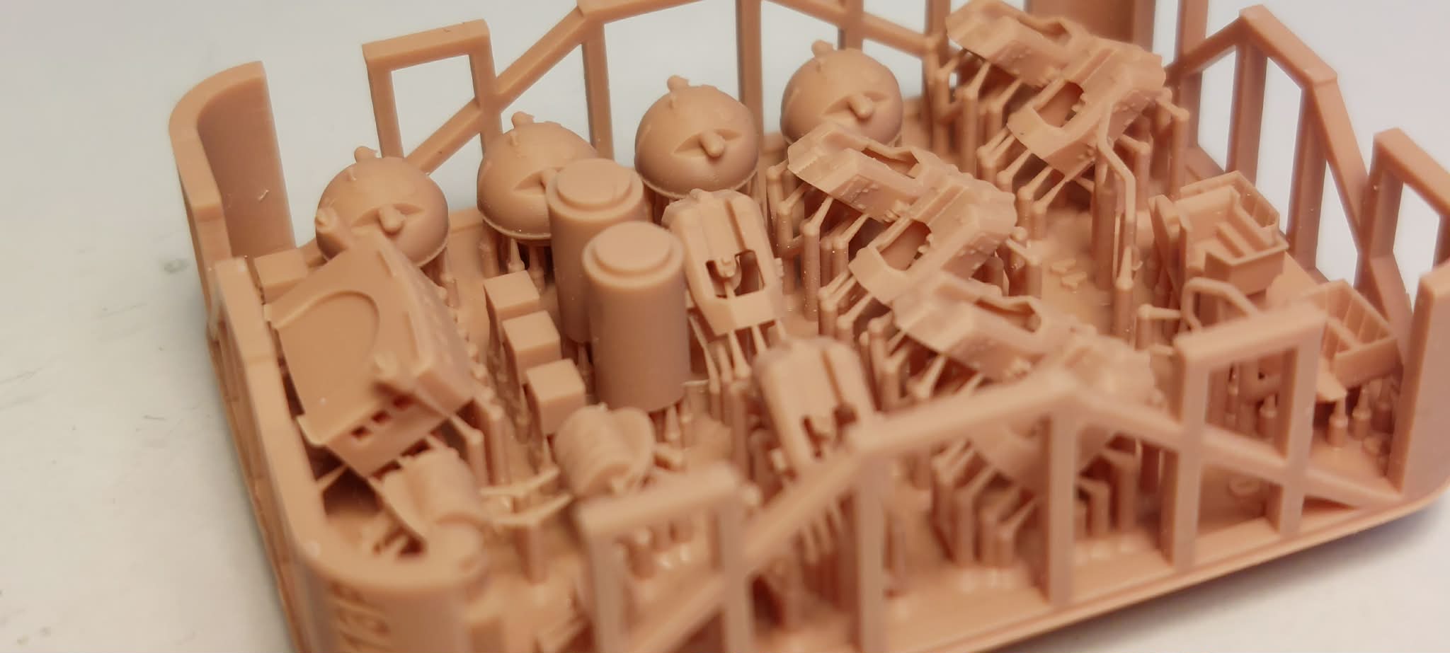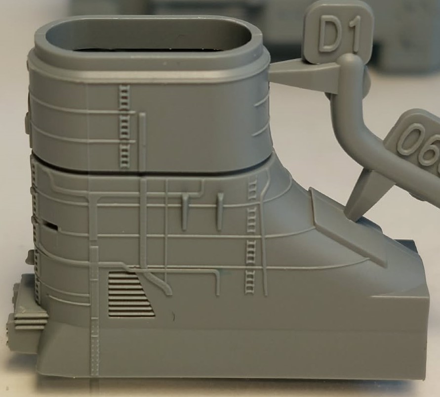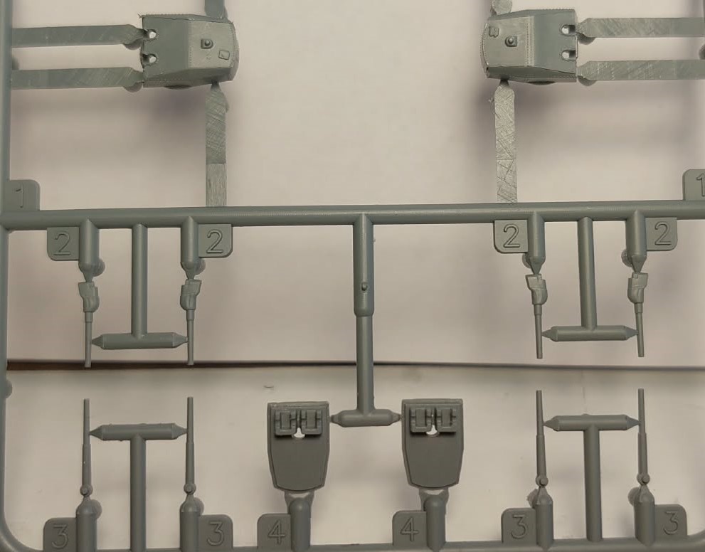 If you’d like to continue, there are still quite a few parts waiting for you. As I mentioned, the kit includes two blocks of 3D-printed parts, photo-etched parts, and turned metal parts. The first 3D block contains the hangar and the elements of the armored command bridge, printed with breathtaking detail.