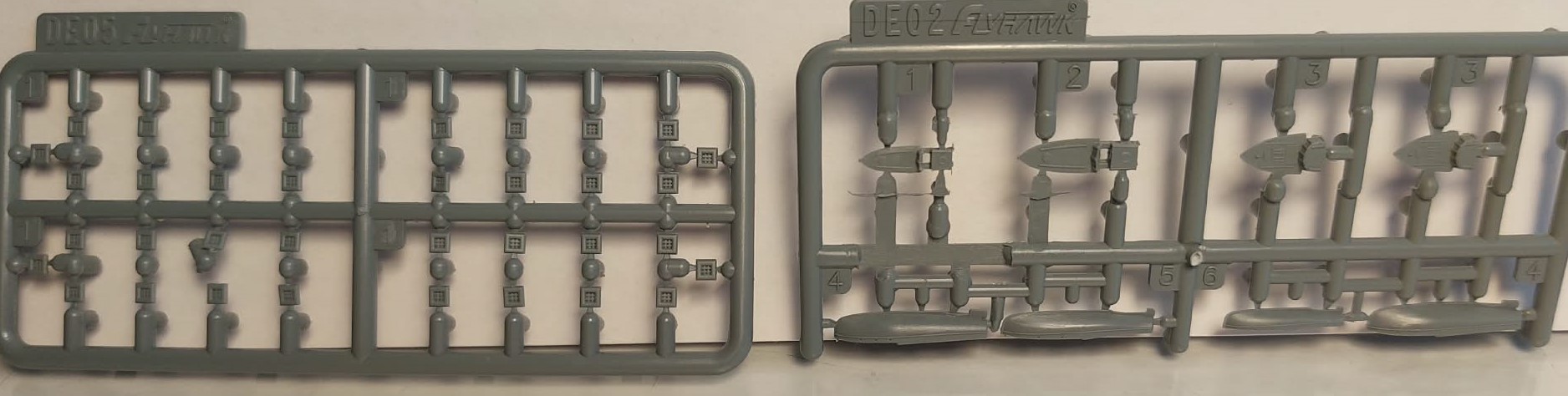 The following sprues show quite a few elements belonging to the deck or superstructure: the boat davits, various hatch covers, vents, the anchors, and the deck crane built into the funnel. The details here are also impressive. Note, for example, the imitation of the opening mechanism on the torpedo tubes, or the cables wound around the drums.
