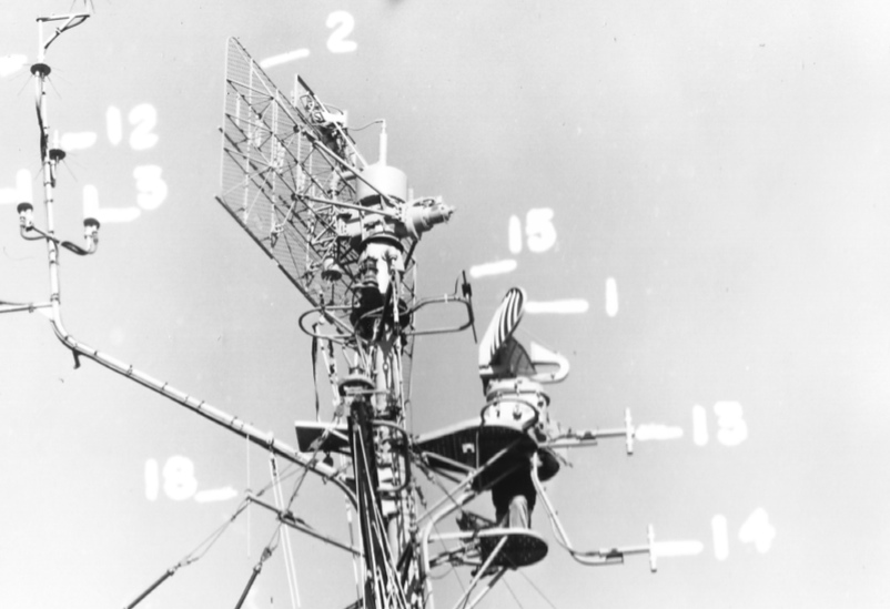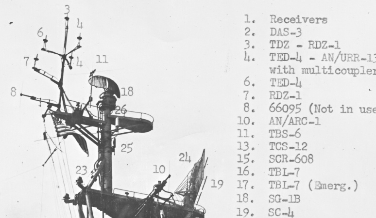 As for the SURFACE SEARCH radar at the top of the mast, I have to admit I'm confused, is likely a SG or SU radar from post-war era. The photo of INGERSOLL (image 4) I have from 1956 looks like she still has a SG-1B/SU- radar that many FLETCHERS had before upgrading to the SPS-10 by 1956. From Friedman's Radar book, the versions of surface search radars used post war was quite fluid, with antennas being modified for existing radars. Unfortunately he doesn't provide photos of them. The SU series didn't get installed until post-WWII and were intended by the time of the Korean War to be replaced by the SPS-10, so which radar this one is is a question mark to me, but does look like a SU antenna shown in Friedman's book. My confusion comes from the labeled photos of the antennas installed on FLETCHERS that I'm finding at the National Archives. At the bottom are a series of four radars photos (images 5-8) from various FLETCHERS in 1954-56 that have labeled this radar as a "SG-1B". The first of these photos (image 5) looks like the WWII SG series of radars, but the other three are also labeled with "SG-1B" radars with various air search radars (image 6 w/a SC-4 radar, image 7 w/a SR radar, and image 8 w/a SPS-6C radar) look like the SU photo in Friedman's book. I'm puzzled ... either the labels are wrong or they used the same or similar antenna on both radars? Looks like I need to do some more digging ... sigh.