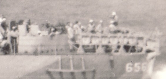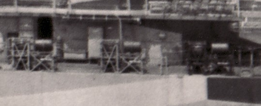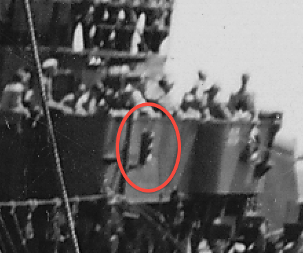 It is very difficult to see, but it appears that there may something painted on the support bulwark for the midship 40mm gun mount. Some (maybe all?) of the ships in Destroyer Squadron 54 carried a large red painted number in this location at the end of the war. I am interested to know if this is one of those ships with a number.