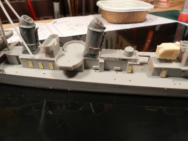I am using the Trumpeter kit as the basis and have used the stacks from the Tamiya kit, photo etch from multiple sources and have augmented the kit main mast to create the tripod mast. This is my first ship model since I was a teenager (many years ago) and find that there is a great deal of forethought required to plan the build and subsequent paint. the model is stacked up for pictures but the deck levels remain unglued and removable. I have studied another section of the site for instructions on simulating water and have given that a try too. I would welcome and hints, tips or criticisms. If this post needs to move to another section the mods should feel free.