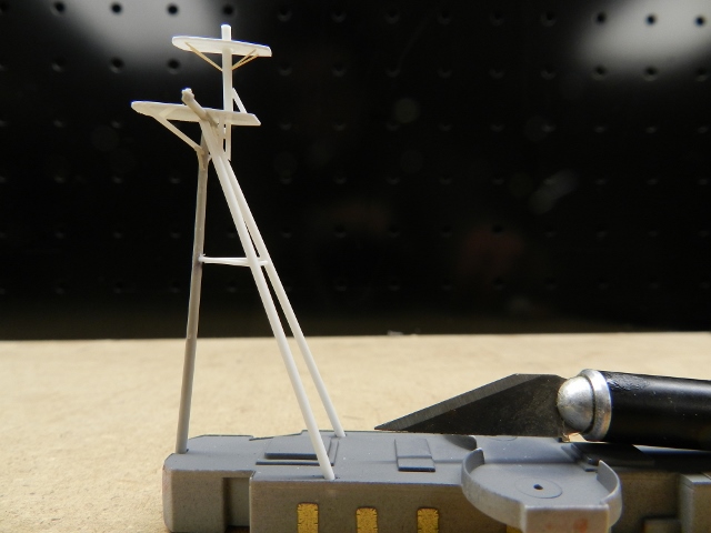 The stub mainmast is the WWII era ECM mast, I think it is in the Trumpeter kit. How good it is out of the box from the kit, I can't recall right now. Many people replace it with photo-etch.