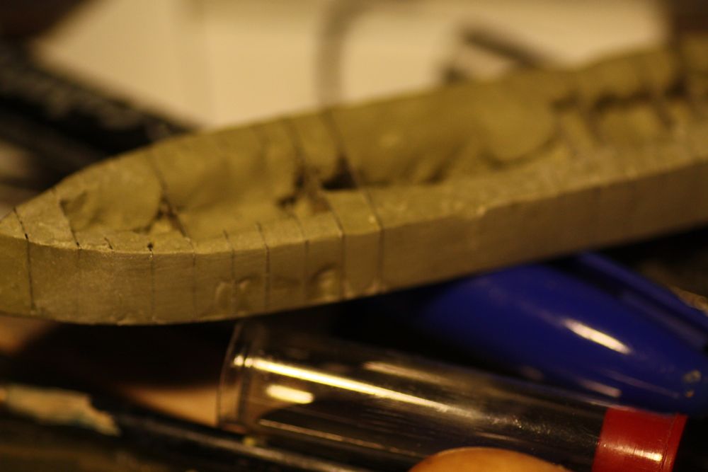 I found it more or less impossible to sculpt the precise shape of the hull sides from wet putty, so decided to 'oversculpt' the contours and then sand and file them down once the milliput had hardened.