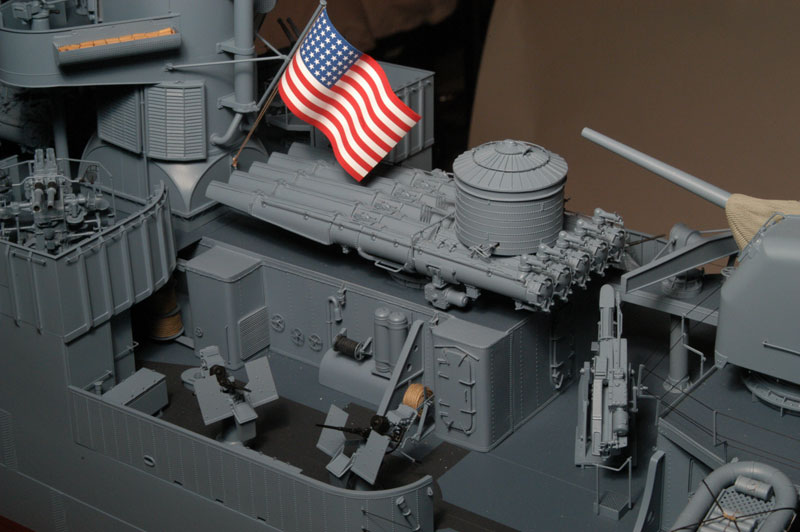 The two kits available in plastic for this "Square Bridge" ship that can be used to build the WWII version are the Tamiya Cushing kit and the older SW-01 Callaghan kit. I would recommend the Tamiya kit as being the better of the two. The Trumpeter 1/700 The Sullivans kit will only build the late war configuration of 14-40mm guns. Depending on how accurate you wish to build the model, there are things that could be (should be?) upgraded to the kit (like replace the 5-in. gun mounts with better and truer scale ones).