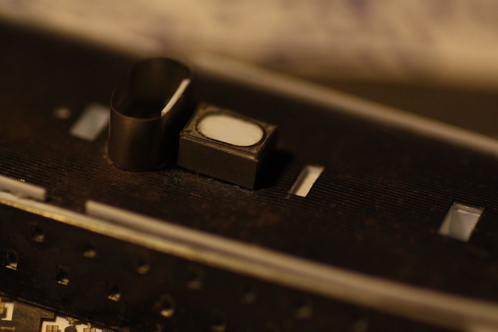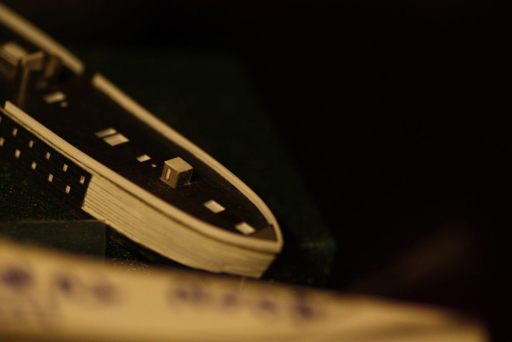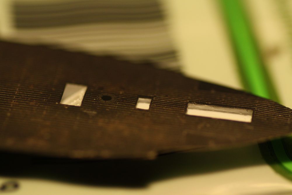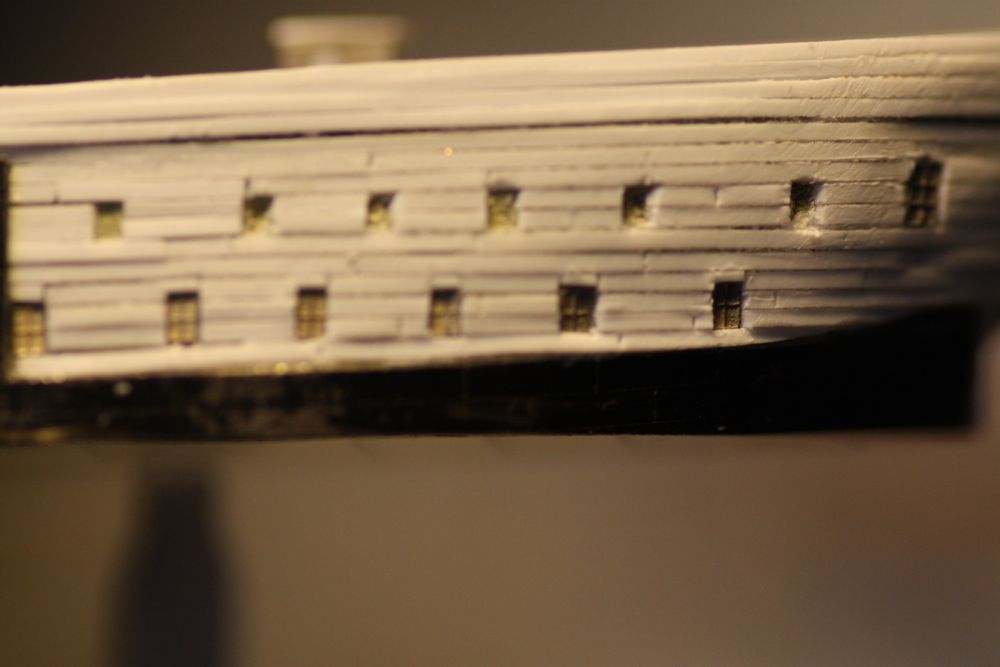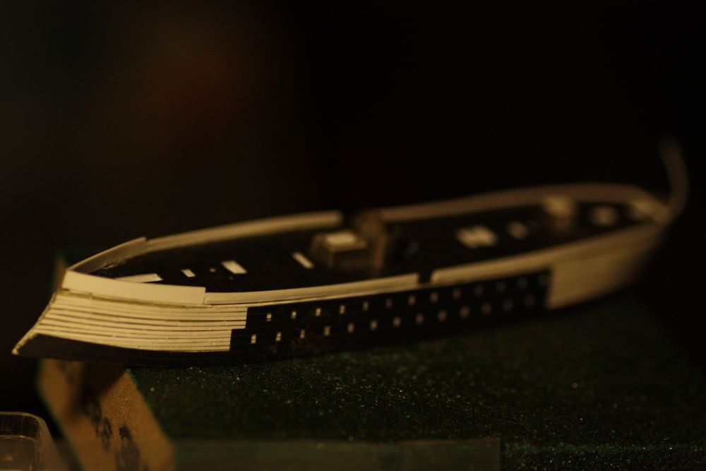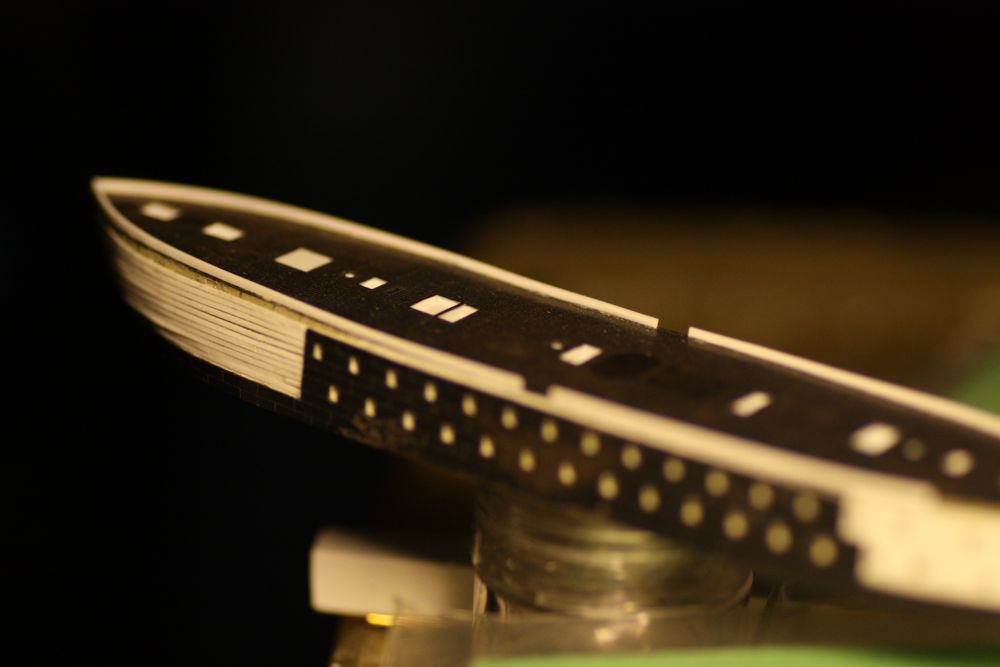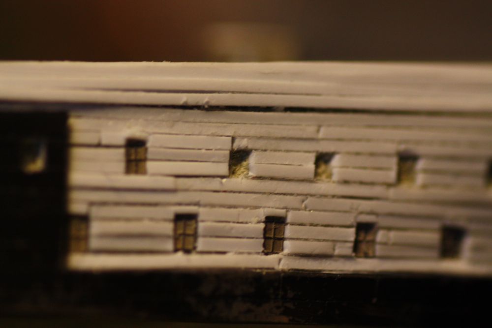 Ok, so here we go.Planking up the port side. Very challenging to get the planking patterns to match Port and Starboard. The tumble-home of the bow, and the undercut of the stern caused problems in the laying of the plank rows, which I was able to counteract on the bow by carefully spacing the upper rows of planks slightly to keep them level with the horizontal plain of the ship. The stern however was another matter... Port side planking complete. A little rough amidships but no matter, as the PE armor plate covers this entire area.Port Armor mounted. Tricky...