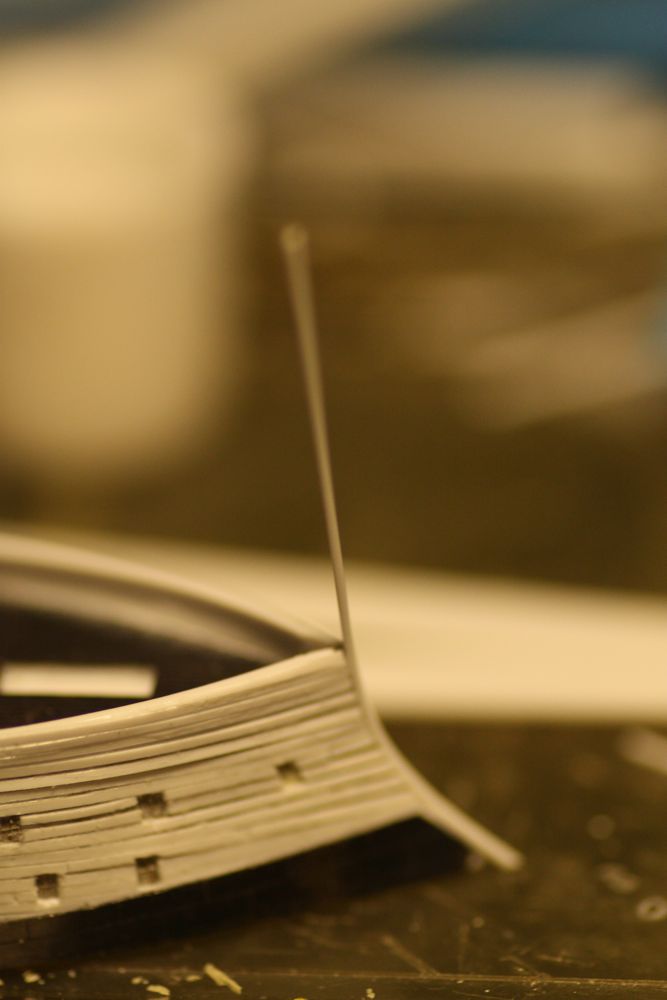 CA does not give you a lot of 'play' time.Here you can see the problem with the stern. The undercut shape caused the plank strakes to curve downward from horizontal as they followed the shape of the hull, ultimately causing a 'hogged' appearance to the hull. For several days I rationalized this, as eventually there will be quite a few window ports, an admiral's walk, and numerous boats suspended from davits immediately above this area, which, in the final analysis would probably hide the defect... but it still bothered me. The real clincher was in considering the shape of the stern, which I had gouged out a little bit too much between the last two frame plates in trying to blend the fineness of the waterline plate shape with the fuller plan of the deck piece. In looking at the stern I realized the shape was slightly 'pinched' and as a result the PE stern walk would probably not fit properly. In considering this problem, I realized I could kill two birds with one stone by stripping off the stern planks, but leaving them in place in the depression, and then sanding them to blend the depression with the hull. I could then re-apply a new set of planks, being careful to keep them level this time... That was the plan, anyway.