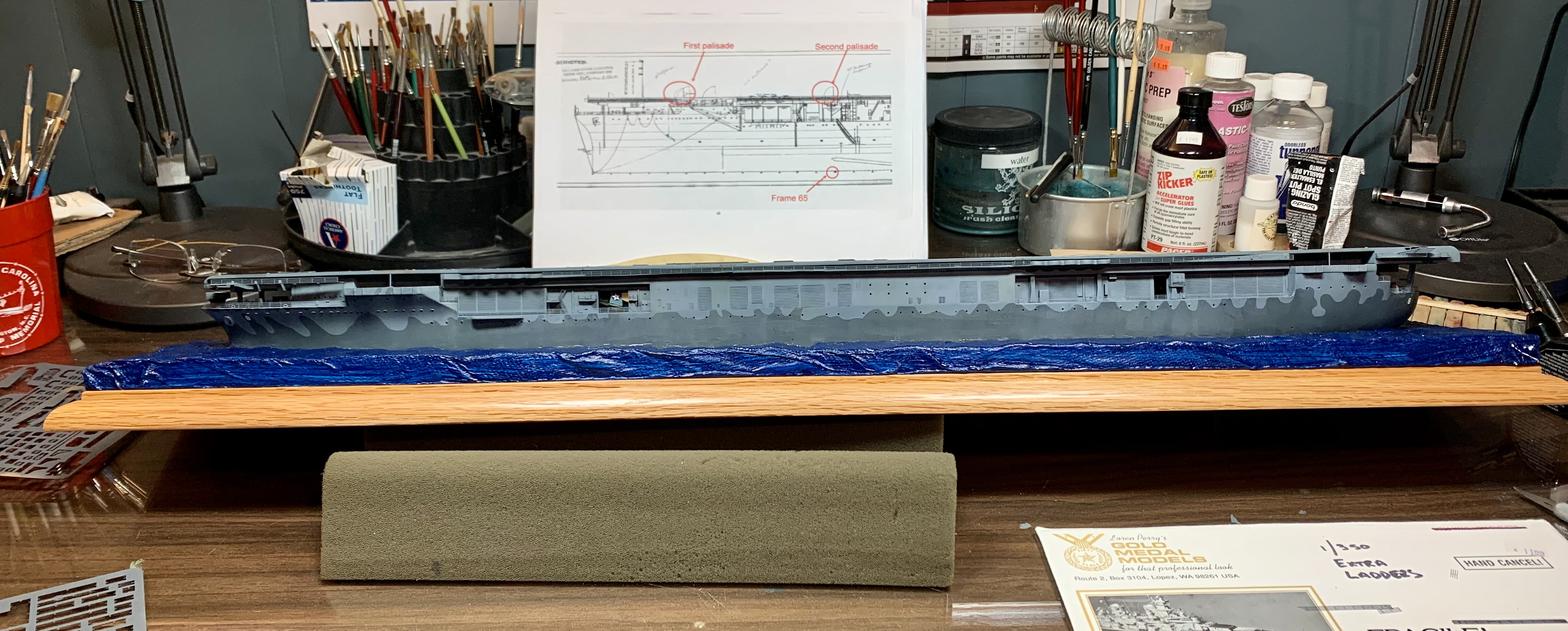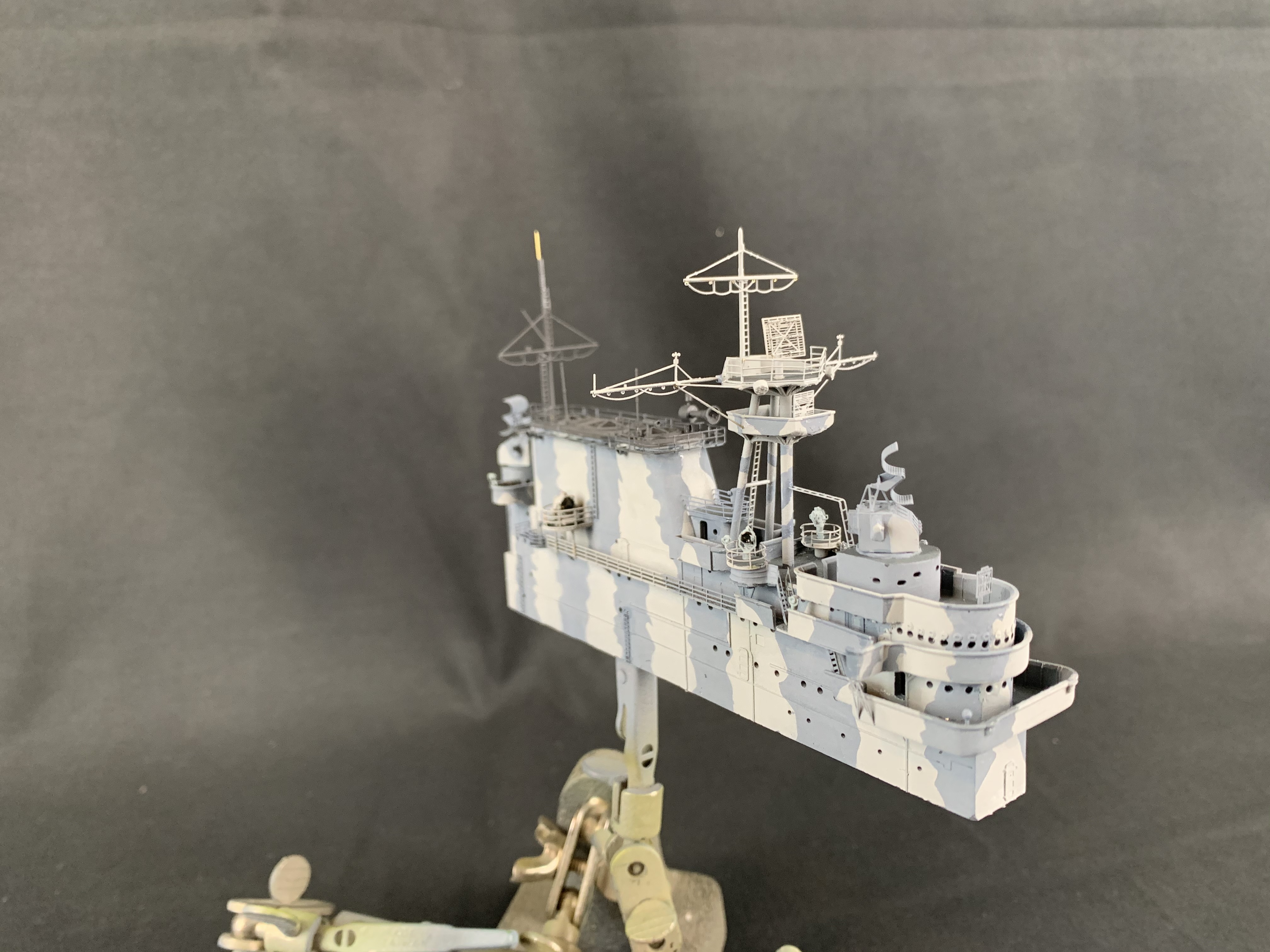 Working on Trumpeter's 1/350 Hornet. Island is from Model Monkey with GMM & Eduard PE, Black Cat 3D printed parts, and some good old styrene sheet and brass rod. The island is about ready for gloss coat and weathering.