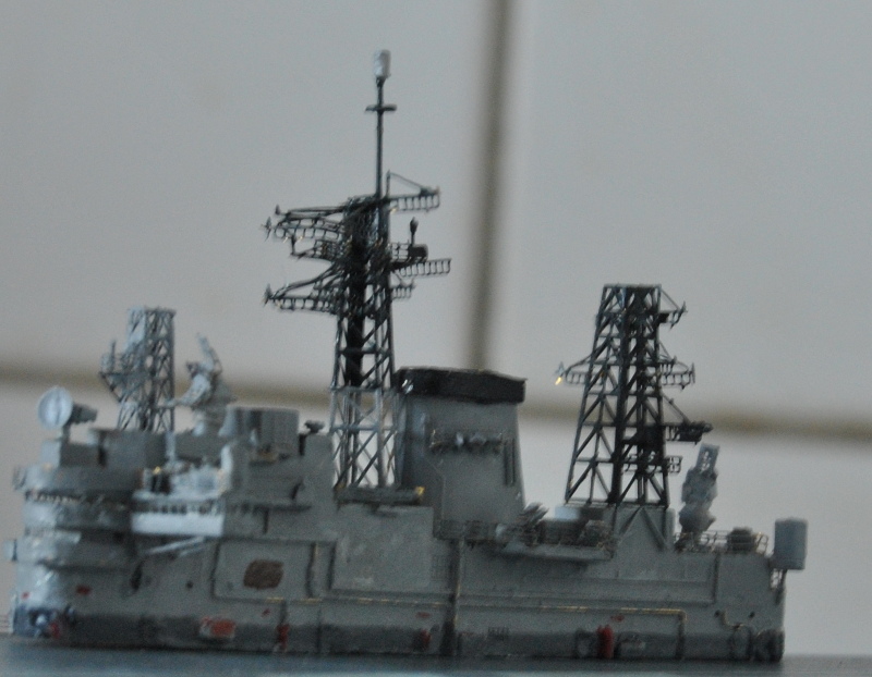 And after that I assembled the rest of the masts on the island. Mainmast and the base for the forward 965 were very quick builds. The parabolic antenna thing on top of the bridge was useless however (casting sprue on the face of the parabolic dish) so it was replaced by a soviet Kite Screech radar from the spares box.