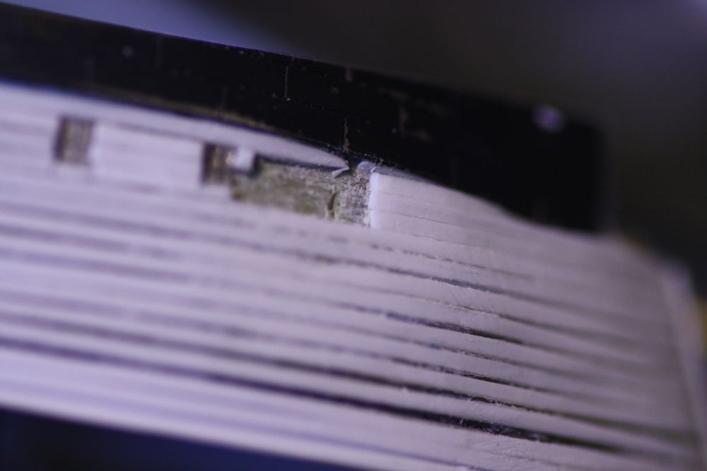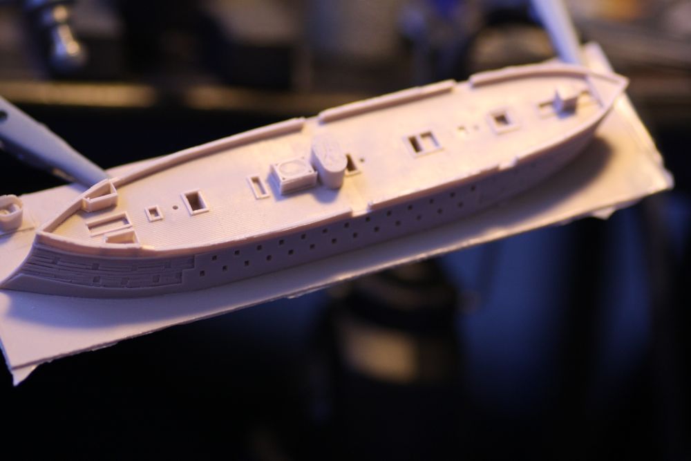 Actually, I was wondering, whether it would have not been possible to make the non-ironclad portions of the hull also from an etched part: taking first the shape off the hull using a paper template and then to draw the windows and plank lines on it for converting into an etching mask; then to etch the part in very thin foil. After annealing it could be coerced onto the hull.