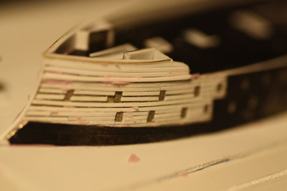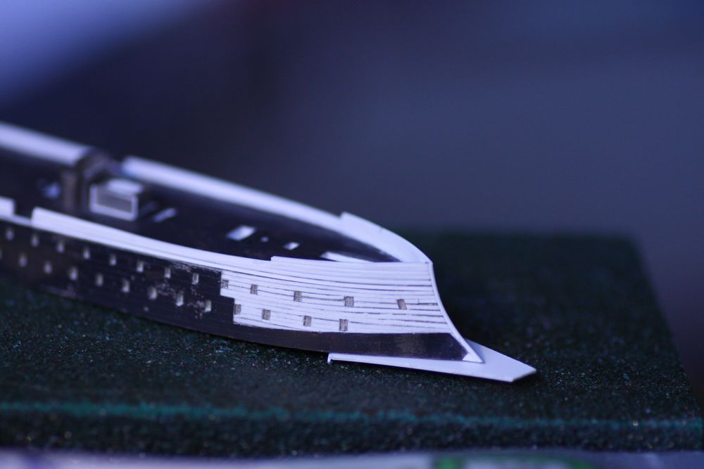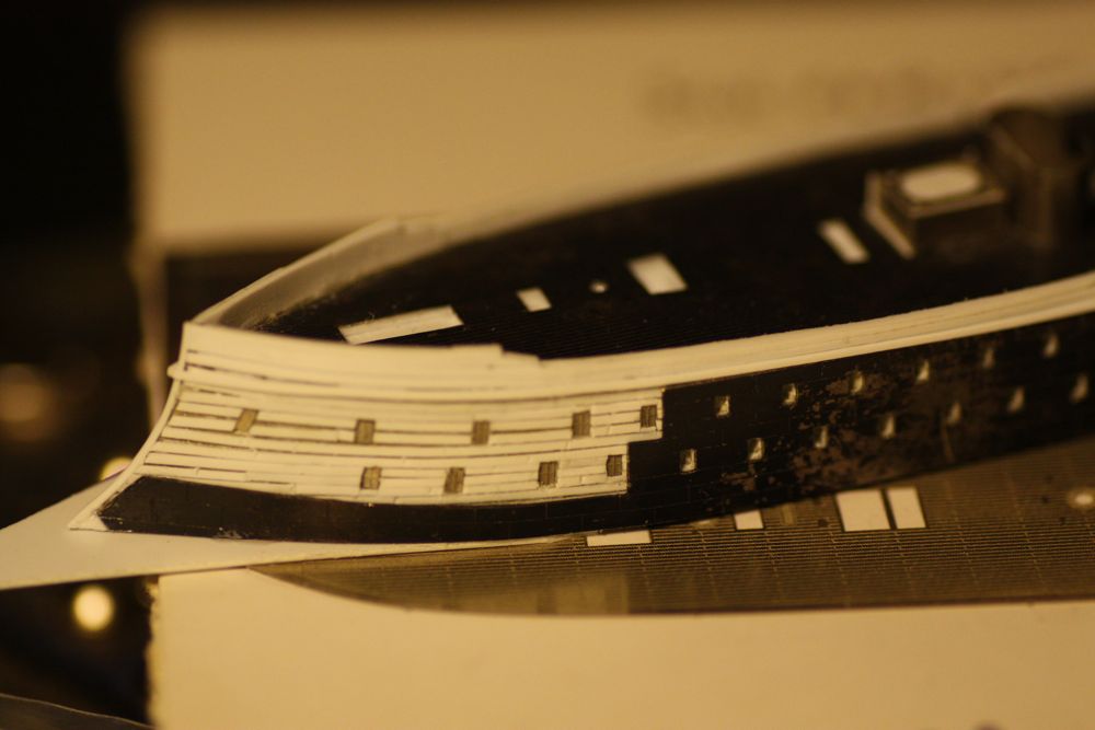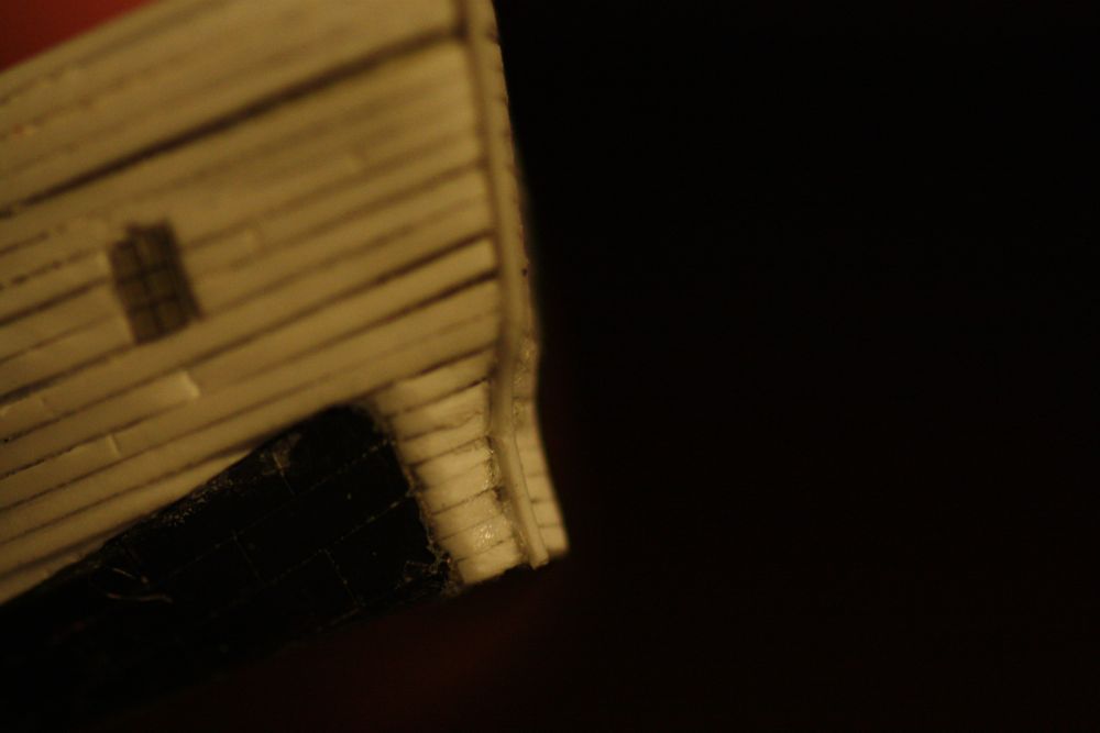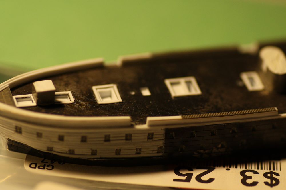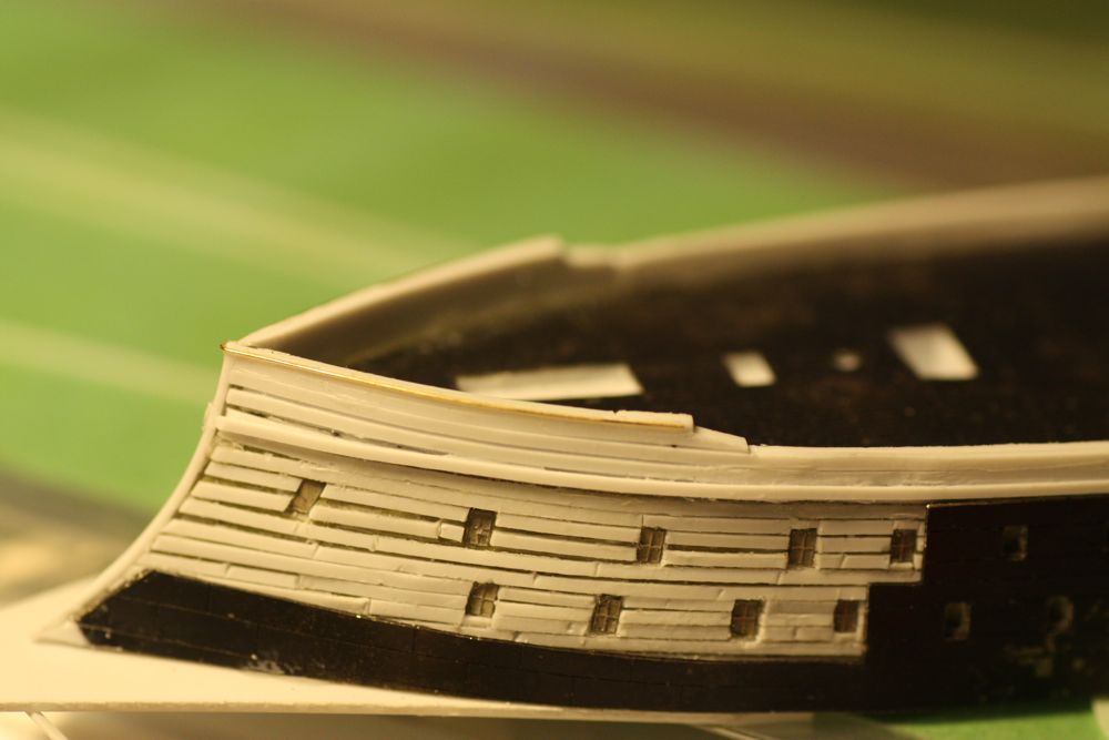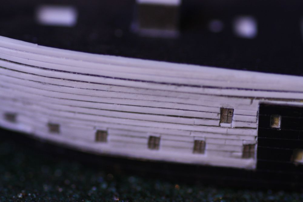 You may notice in some of these photos that the last large window in the upper deck are not aligned. (stbd is higher than port) I didn't actually notice this until I began laying in the upper wale strips...
