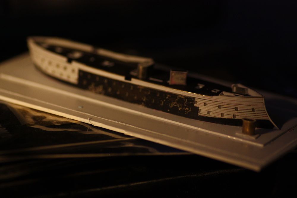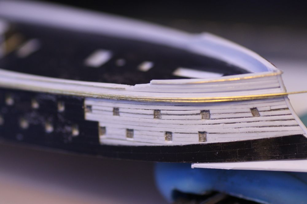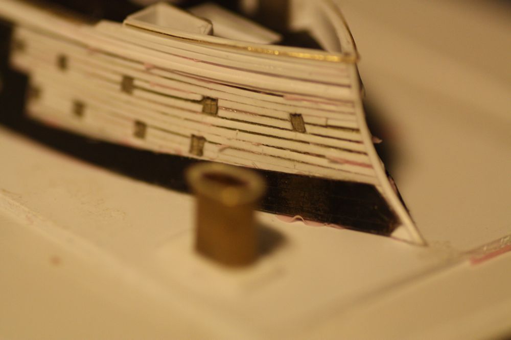 Detailing the lower wales. The actual ship had two rounded wales here. The only way I could think to reproduce them was again with brass wire.