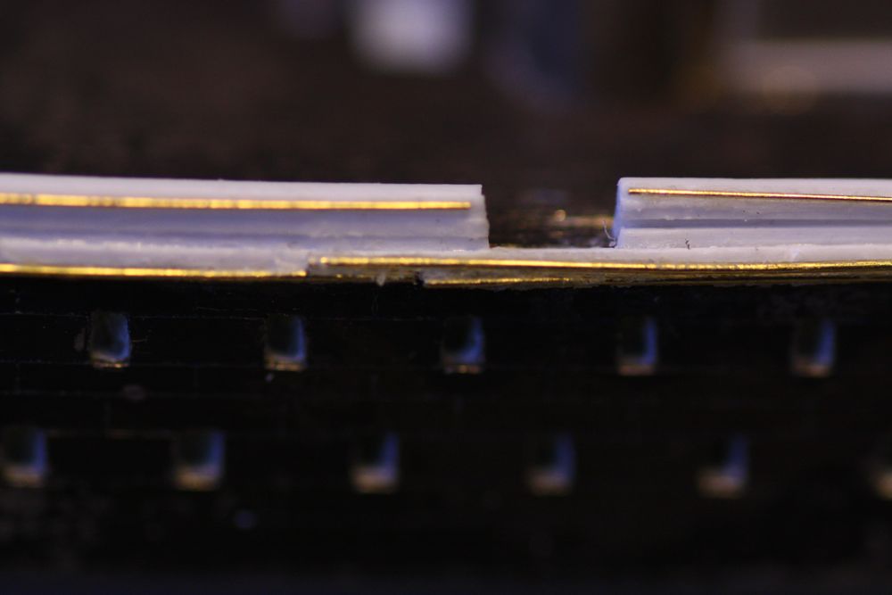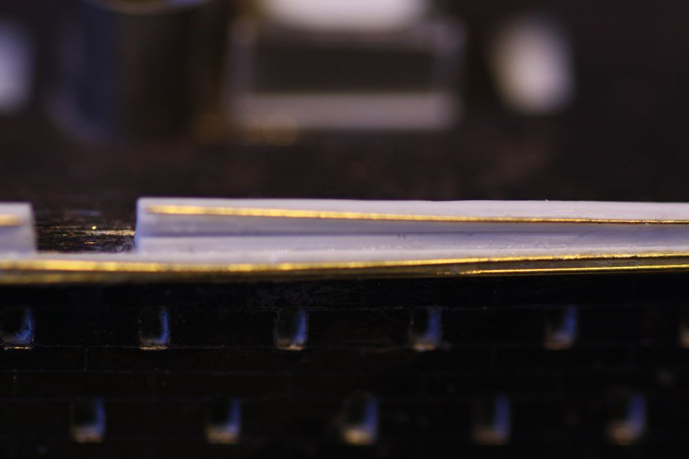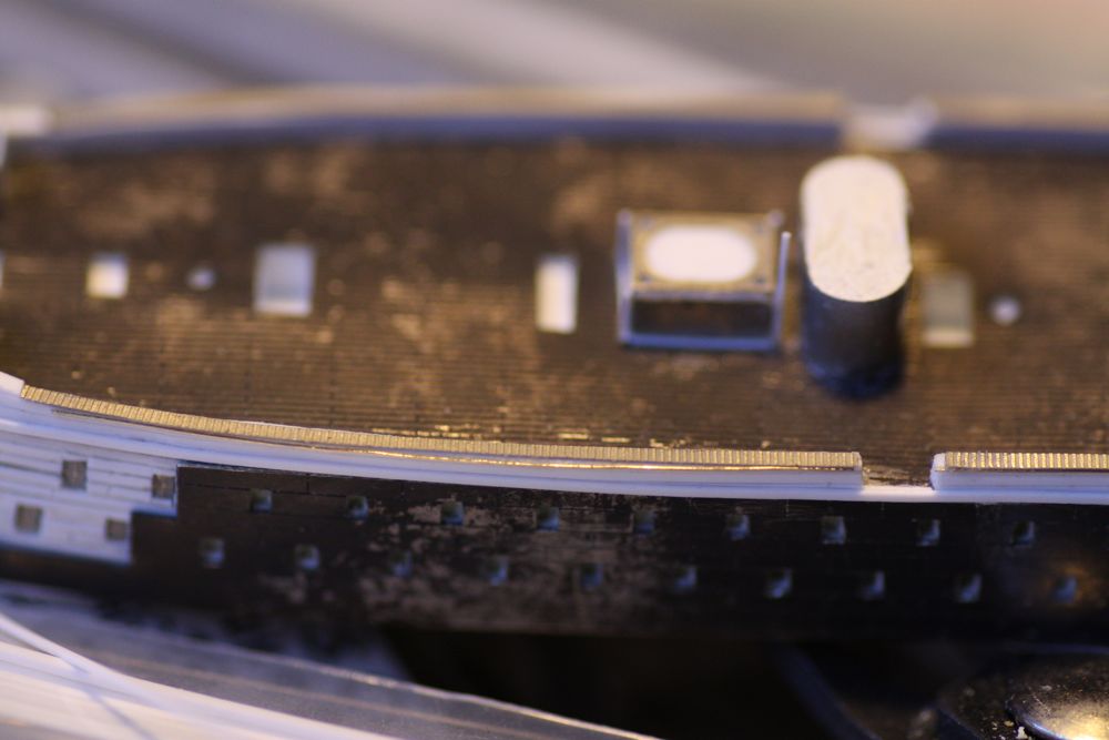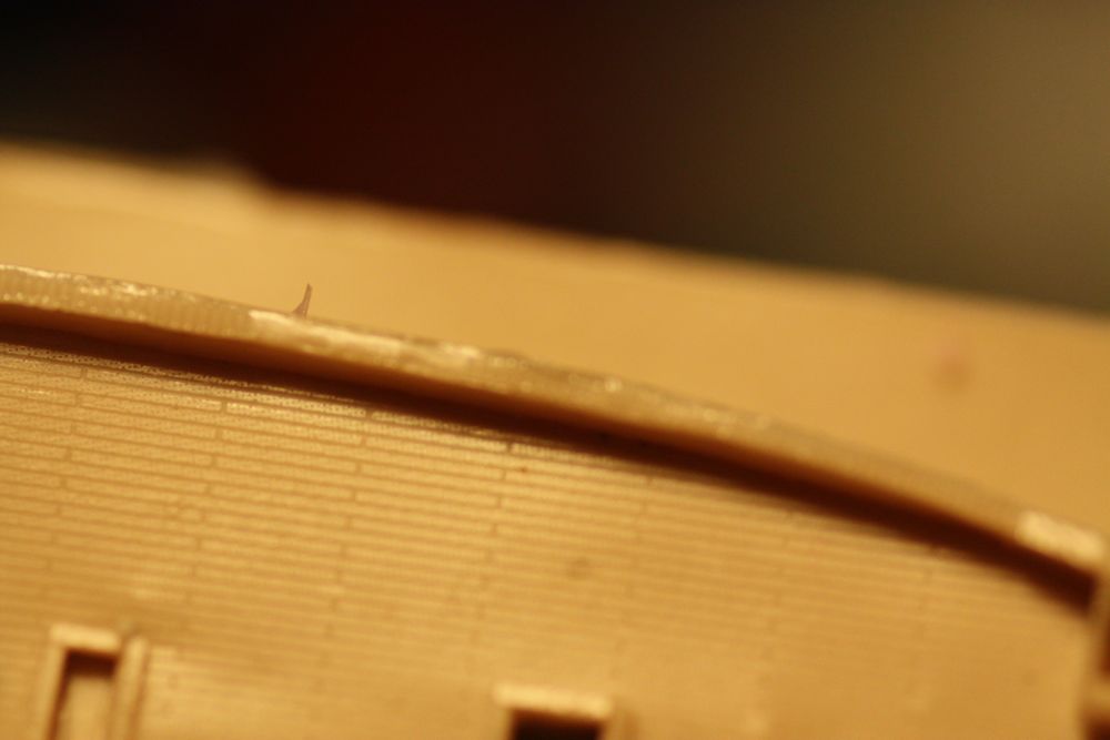 The plan called for a very thin 'lip' or rounded wale on the upper edge of the bulwarks all the way round. I attempted this with my thinnest brass wire, hoping I could glue it symmetrically to the bulwarks with CA. Very tricky... :heh: