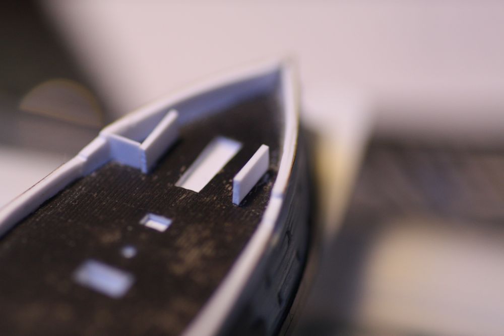 If you look closely at the last pictures in the previous post, you can see that the deck plate around the last hastily fitted companion way took a beating in the process of pulling up and re siting the aft deck house. In thinking about this I realized that the situation could be improved if I were to scratch raised coamings around it to hide the roughened steel at the edge. And that made me realize that coamings for all the deck openings was probably a good idea. :thumbs_up_1: