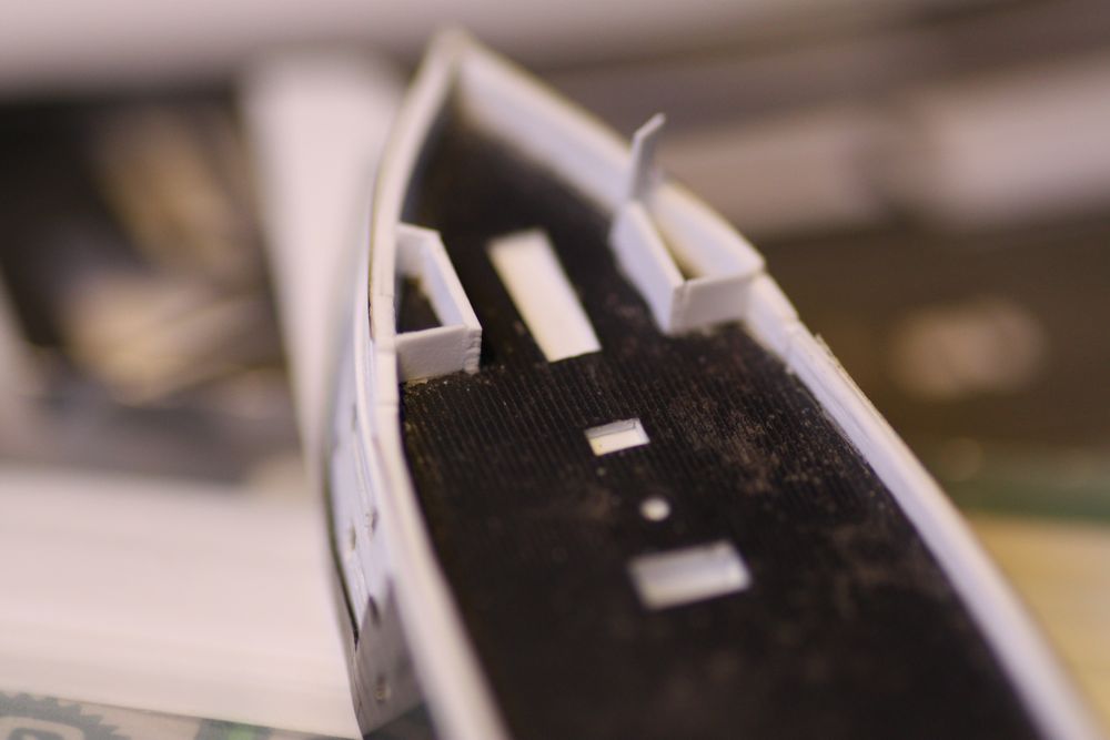 The aft deck house dilemma. After reviewing the plans, I realized I had sighted this little box of a deck house in the wrong place on the stern. There was no avoiding this, not only because the site was wrong, but because I had mounted it where a companion way should be. Prying the part off and re siting it would be no great difficulty, but how to create the companion way box inside the hull where the PE stairs would go later? The inside of the hull is partially filled with putty. Casting the hull with a gaping hole leading to the interior was not an option, nor at this stage could I rip up the deck. I would somehow have to create the box from above and hope for the best. :heh: