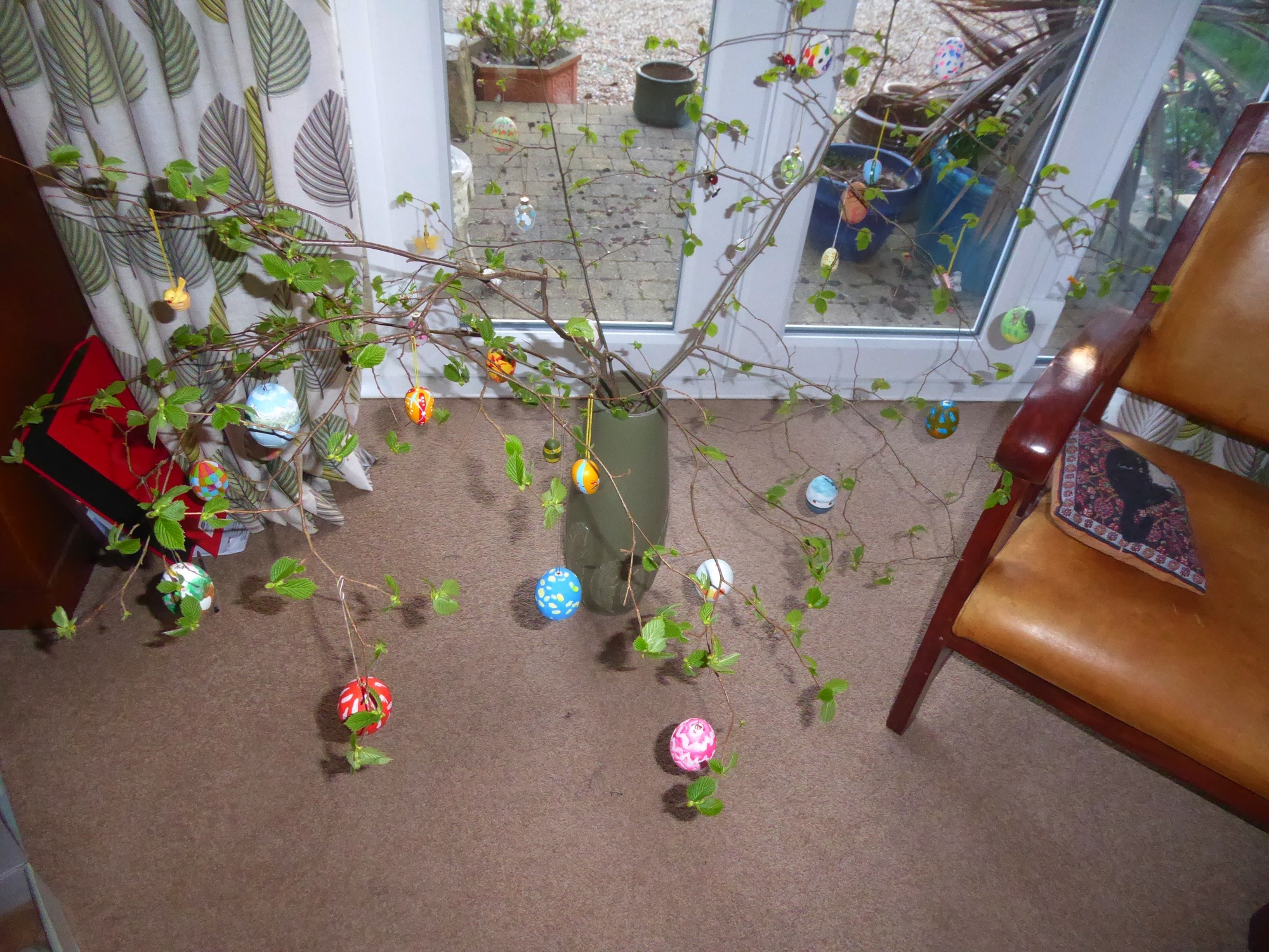Hello all; Happy Easter! Every year we hang Easter eggs on a tree outside as well as on a spring twig indoors Attachment: