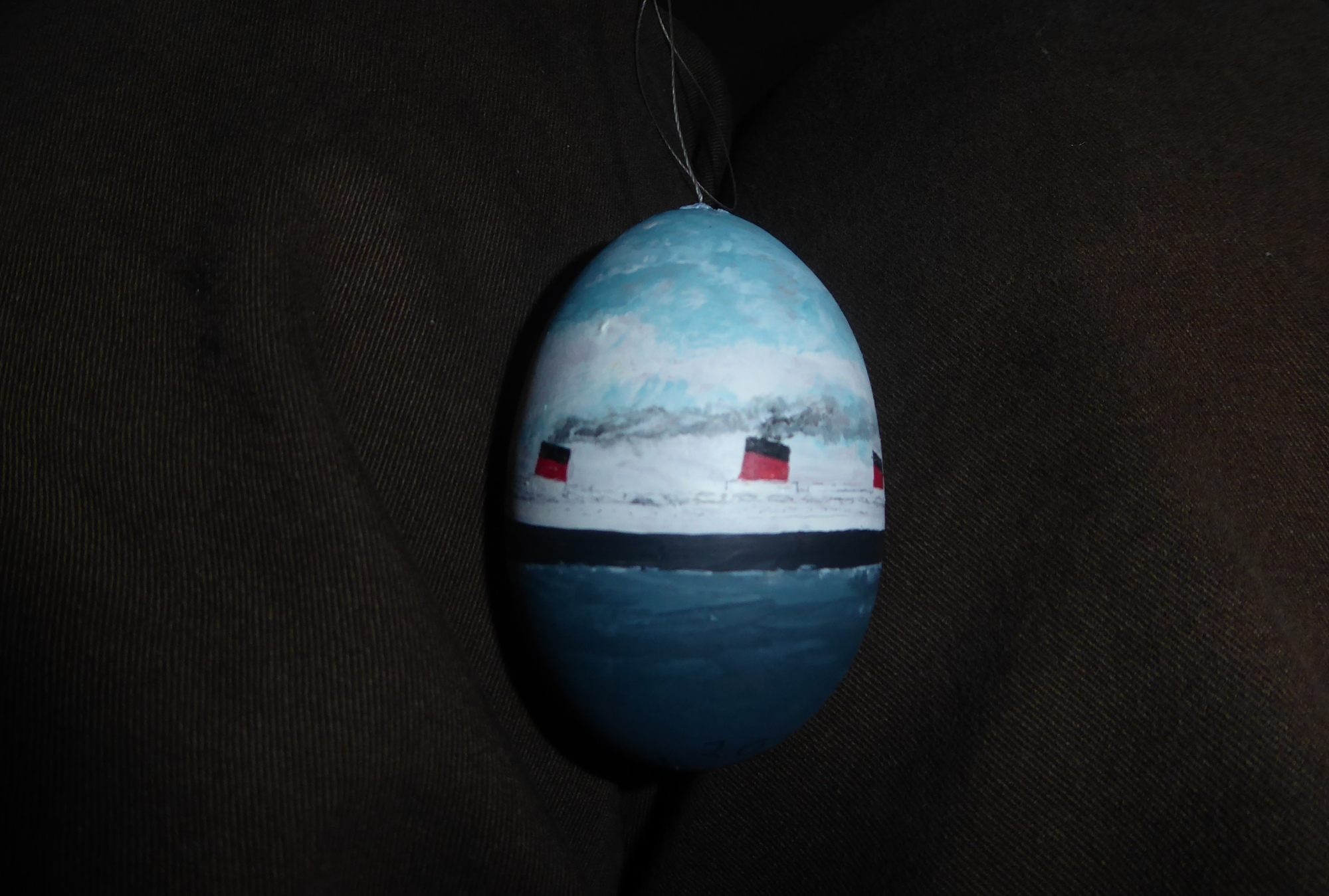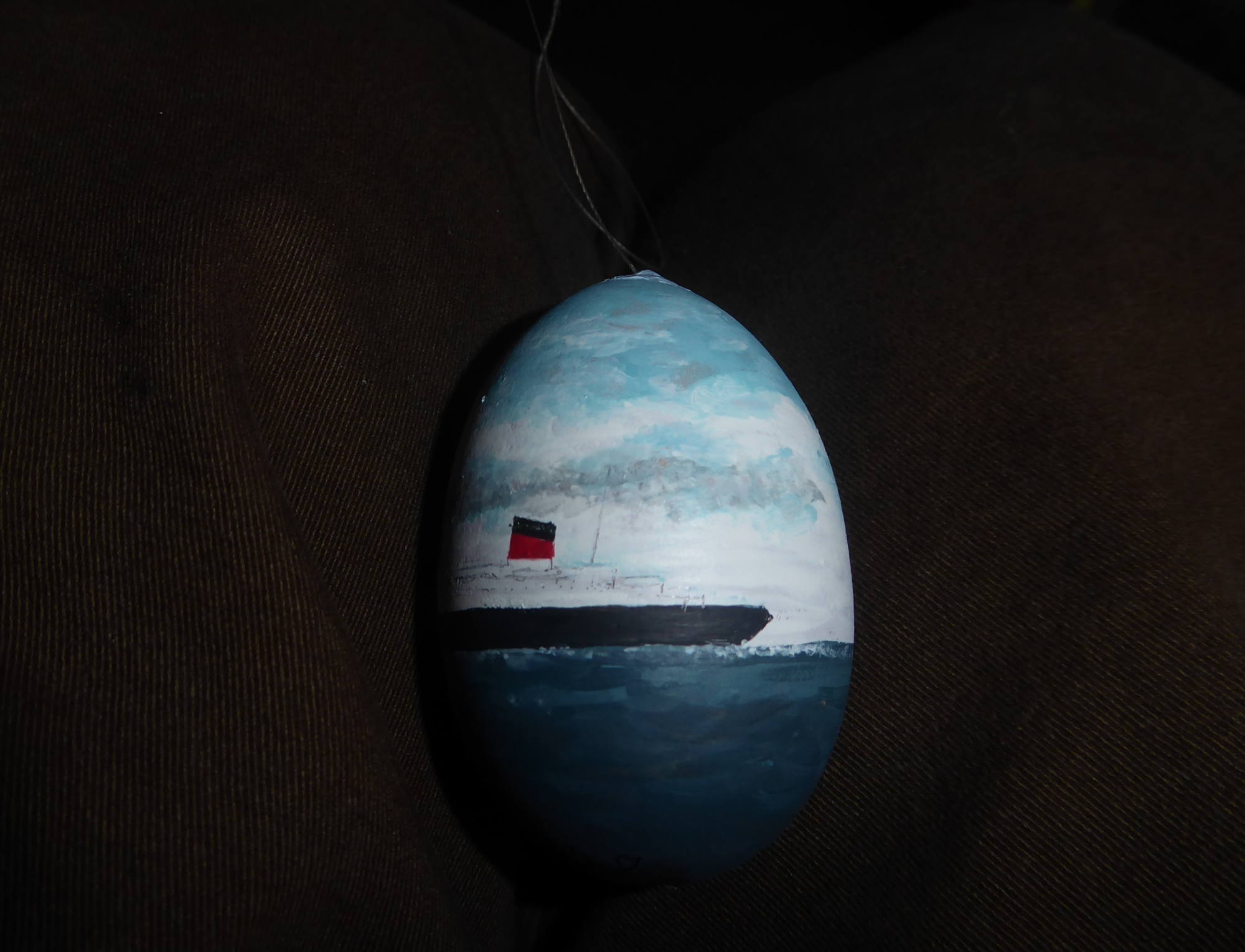 Every year we has a small family competition;= blown-out Easter egg shell painting... Last Year I painted this one.... the circular nature of an egg does not lend itself well to painting a long liner... It hangs proudly ! ( kinda topical!!  )