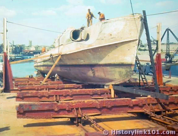The hull was built of aluminium alloy metal frames with wood planking. Further details are in the Construction section of the Squadron book. Here is a photo showing the deteriorated hull of a boat salvaged by the Allies. Note the black stripe is actually oil staining from sitting idle in dirty harbour water, and is not a boot top. Judging from the many photos I have seen, boats in service were kept in very good order.