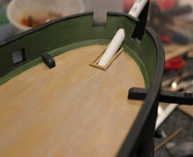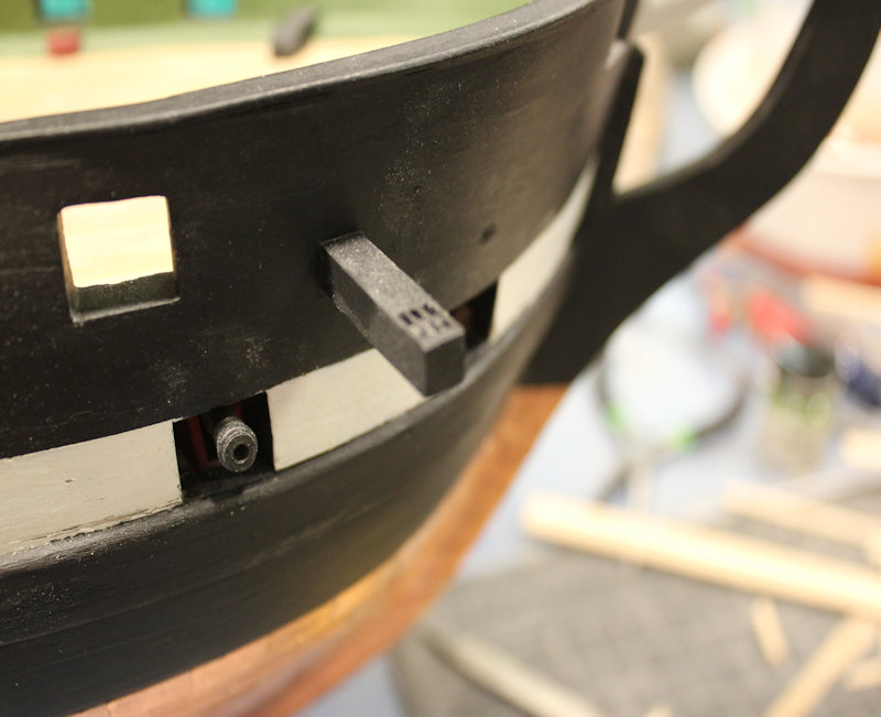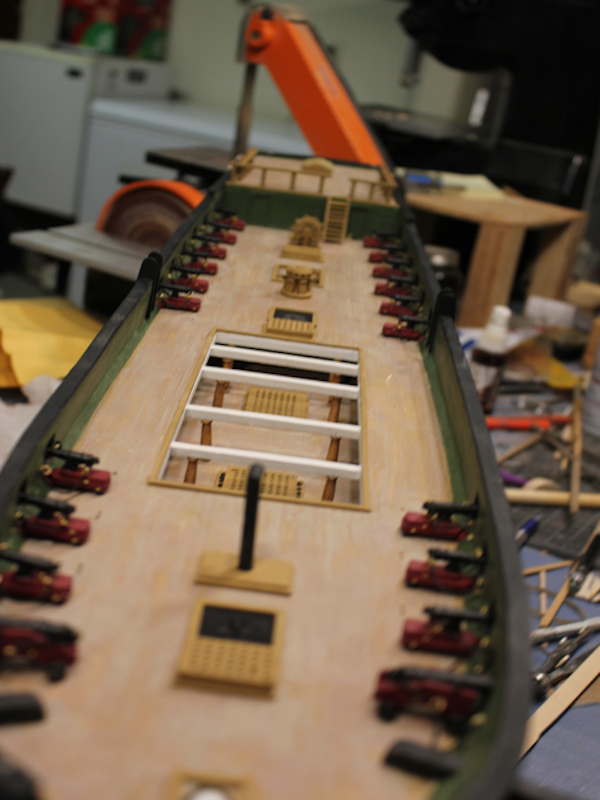 Installing the deck furniture now. Just a few more things left, then I will rig the carronades. I have the side tackle assemblies to rig up. The belaying pin rails are done and will go on when the carronades are rigged. Also laying out the gun ports on the Delaware. Photos of that coming.