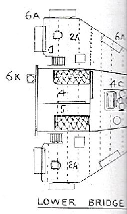 Use drawings 1. Bridge Profile Detail, 2. Lower Bridge Plan Detail and 3. Upper Bridge Plan Detail to scratch build the missing detail parts. From drawing 2 item 2A is a small signaling search light, build 2 and place on the cones on part B3. Item 9A is the Director Control Tower, scratch build this and add to the bridge. Item 19A, Torpedo Deflection Sight Stand, is shown as a small bump in the bridge deck, scratch build two, see 4. below for details. Item 4A, Chart Table will also have to be scratch built from scrap PE. In the back corners of the upper bridge place WEM PE part 74, Bridge Semaphores. Items 6A are Signal Flag Lockers and will have to be scratch built. Item 6K is the Aerial Truck and is correctly positioned on the back of part 19, there should be a ladder running up to it from the deck, use WEM PE part 7 to make this.