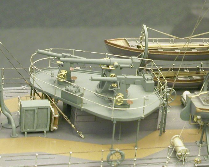 You may use 4-inch guns parts B1 as directed or you may follow the WEM PE instructions. Here you cut away the gun shield and shape a 4-inch gun on a pedestal. WEM PE part 53 can be shaped into the gun shield. A small piece of scrap PE can be bent to represent the loading arm, see Colour Guide or 11. for details.
