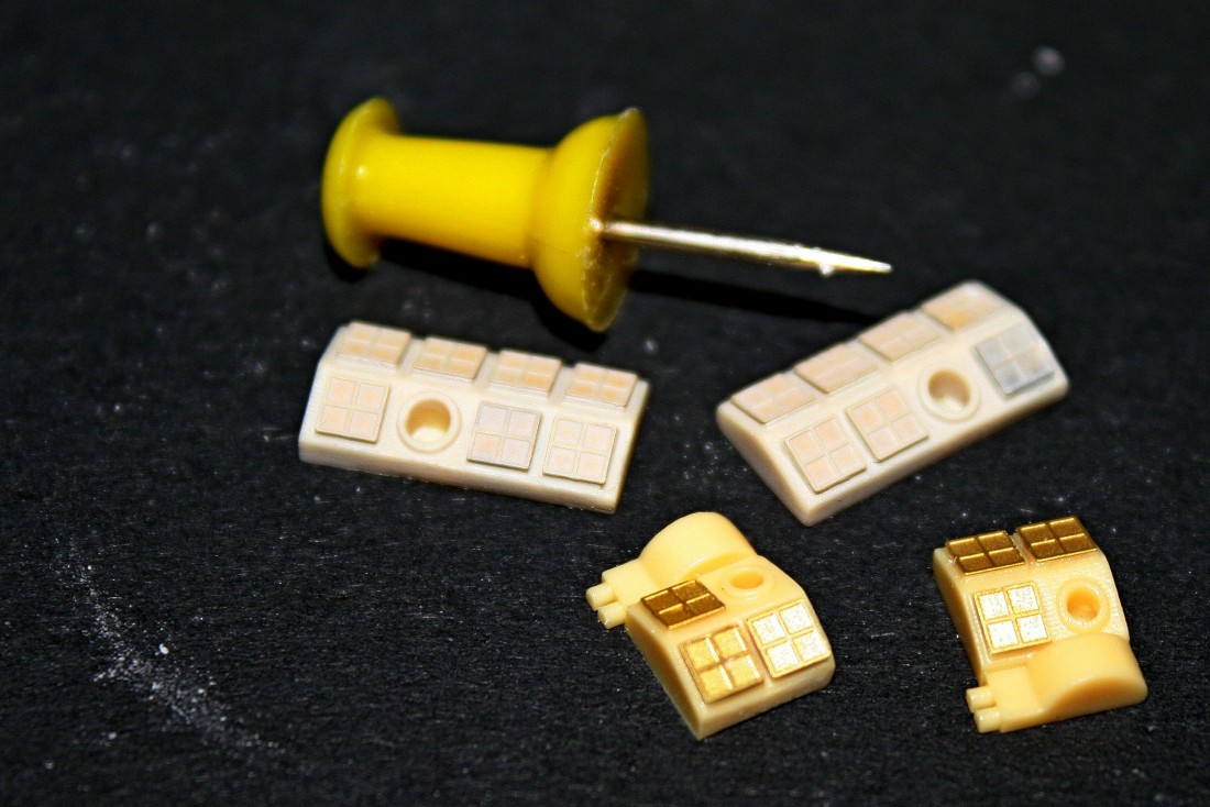 The skylights are supplied as resin casting with ( openable ) PE window framed hatches. ( looks like windos on the plans and other models I have seen)