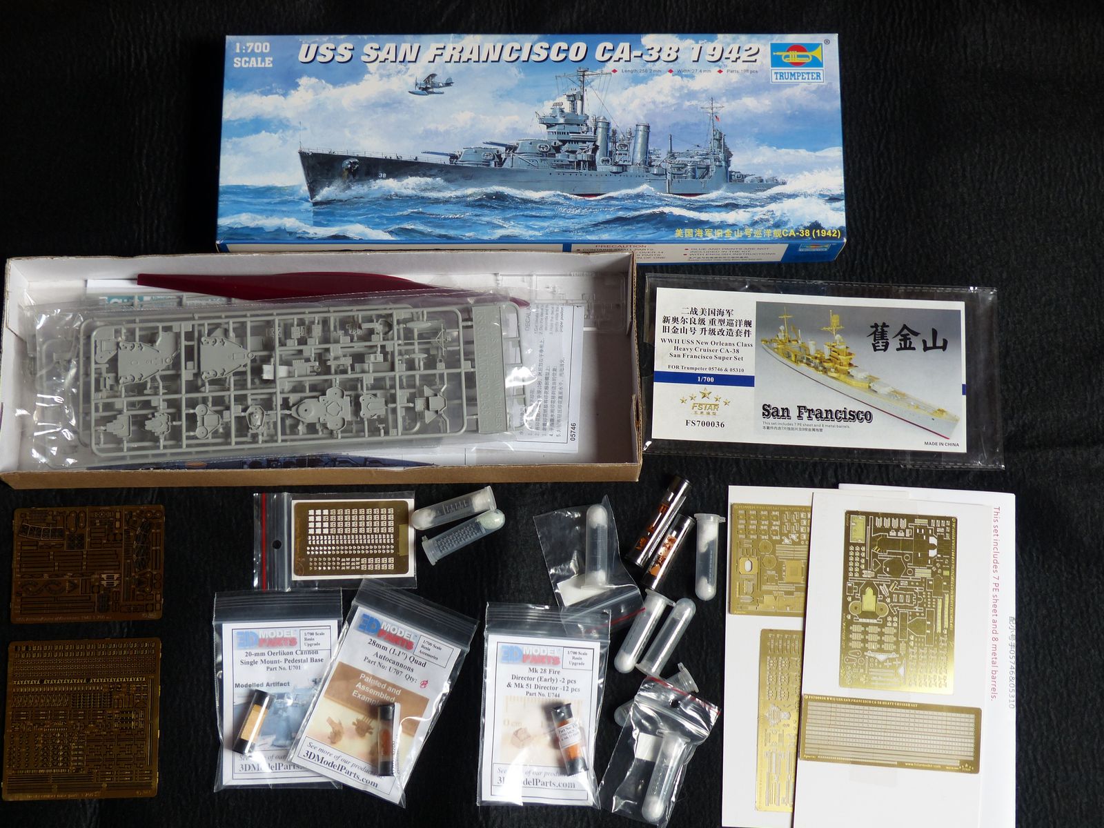 on their web so I ordered it as a solution for improving the Trumpy kit and adding detail. It contains 7 brass sheets and turned brass main gun barrels. FiveStar promotes you can build 1942 or 1944 version out of it, but upon closer inspection it appears the set was primarily designed to build the 1943+ San Francisco with parts for the 1942 version added perhaps as an afterthought. This can also be seen in the instructions, where the 1943+ version is covered in detail on several pages while for the 1942 version only the bridge and searchlight tower are shown on just over half a page in total.