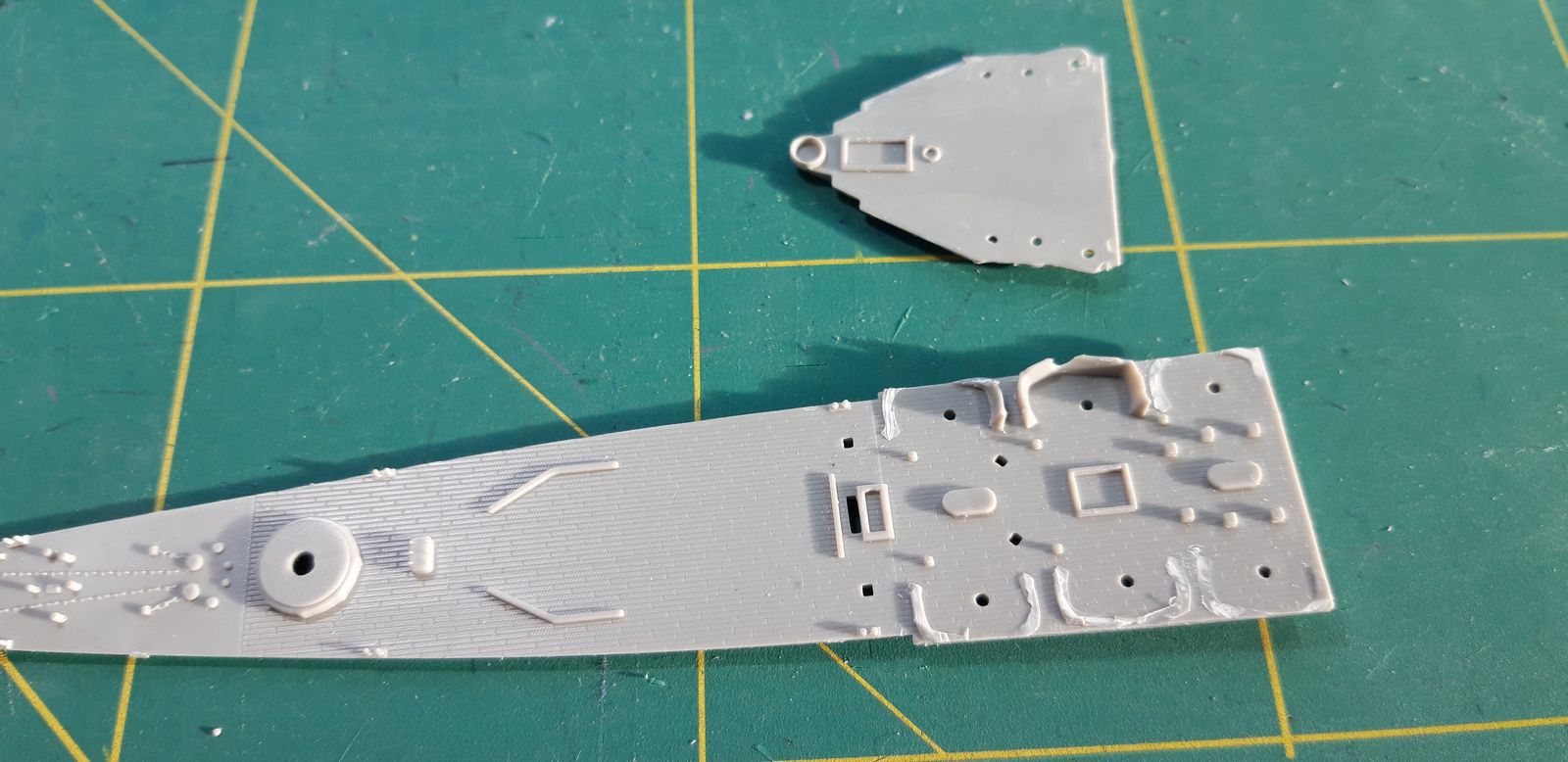 Another annoying feature of the FiveStar set is that some parts – like bulwarks of the bridge, overlay of the hangar superstructure or overlay for the forecastle deckhouse – have accentuated edges by relief-etching, quite unrealistic when compared to the real ship. I am considering to amend this by using these parts reversed, putting their flat reverse side outwards. The disadvantage is that I´d lose relief detail where I liked it to stay, so I´d have to add those details separately. Funny enough, the replacement bridge for the 1943+ version does not have these accentuated edges, so it definitely comes out much better – if it wasn´t totally useless for anyone building the original New Orleans class members as they appeared in 1942.
