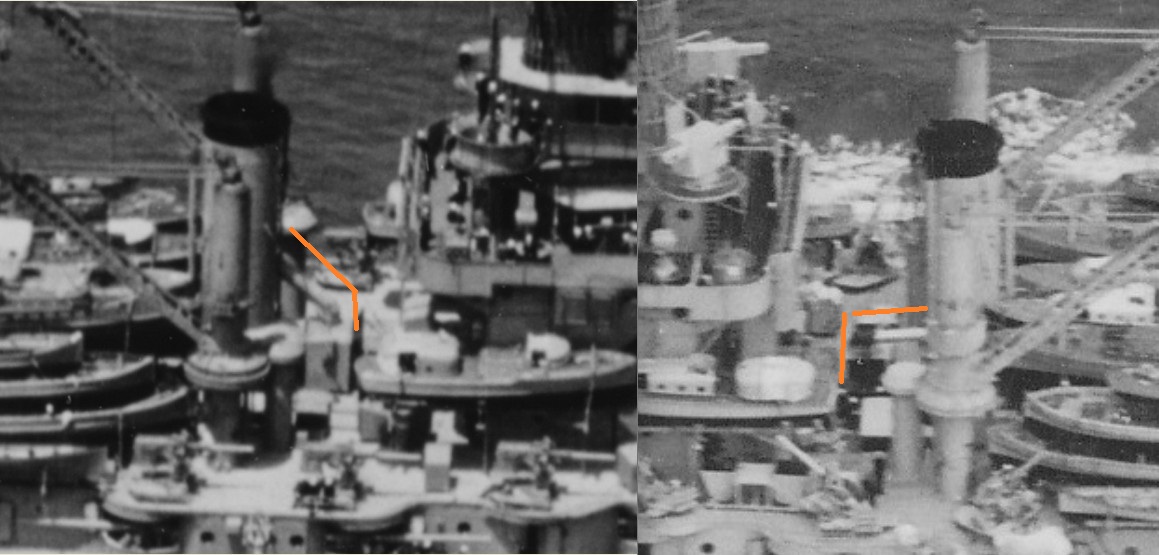Found some additional photos, cropped them to show the forward funnel piping arrangement on BB-48. First one is from 1937, the second from 1939. Photos are from NARA II, via Roger Torgeson.