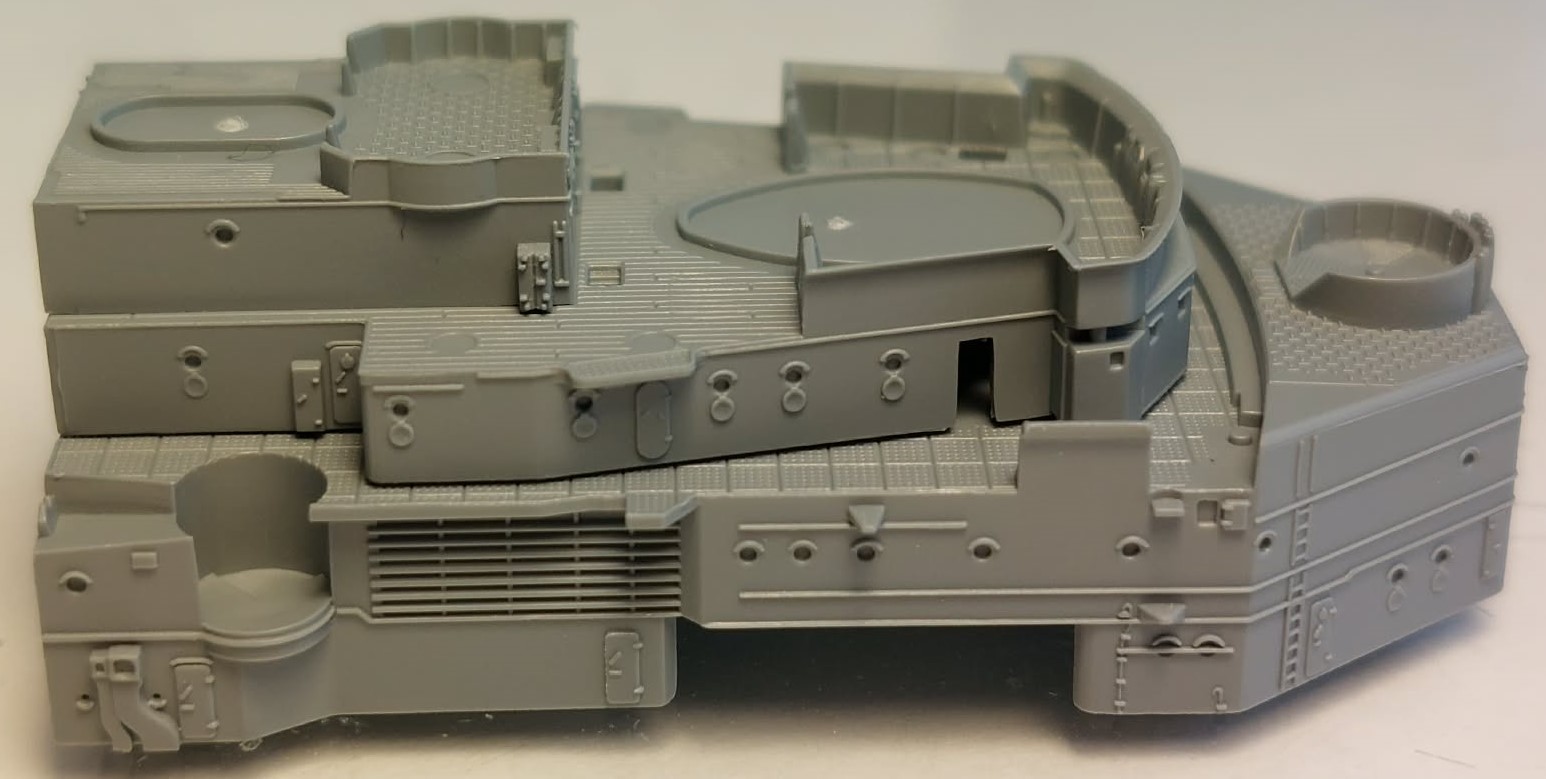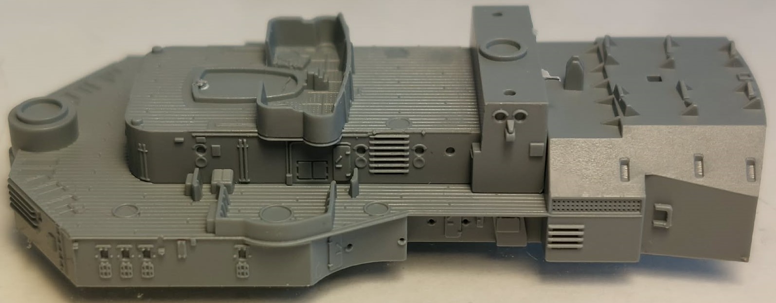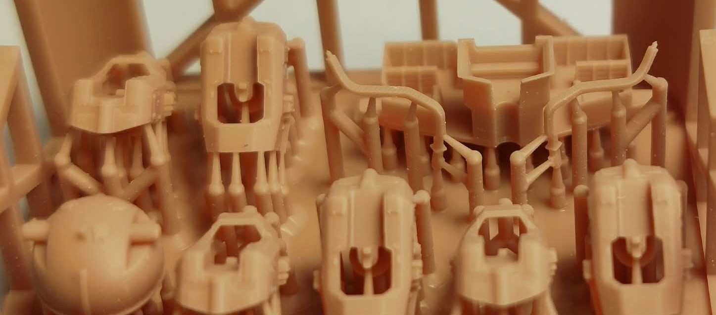 If you’d like to continue, there are still quite a few parts waiting for you. As I mentioned, the kit includes two blocks of 3D-printed parts, photo-etched parts, and turned metal parts. The first 3D block contains the hangar and the elements of the armored command bridge, printed with breathtaking detail.