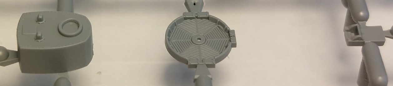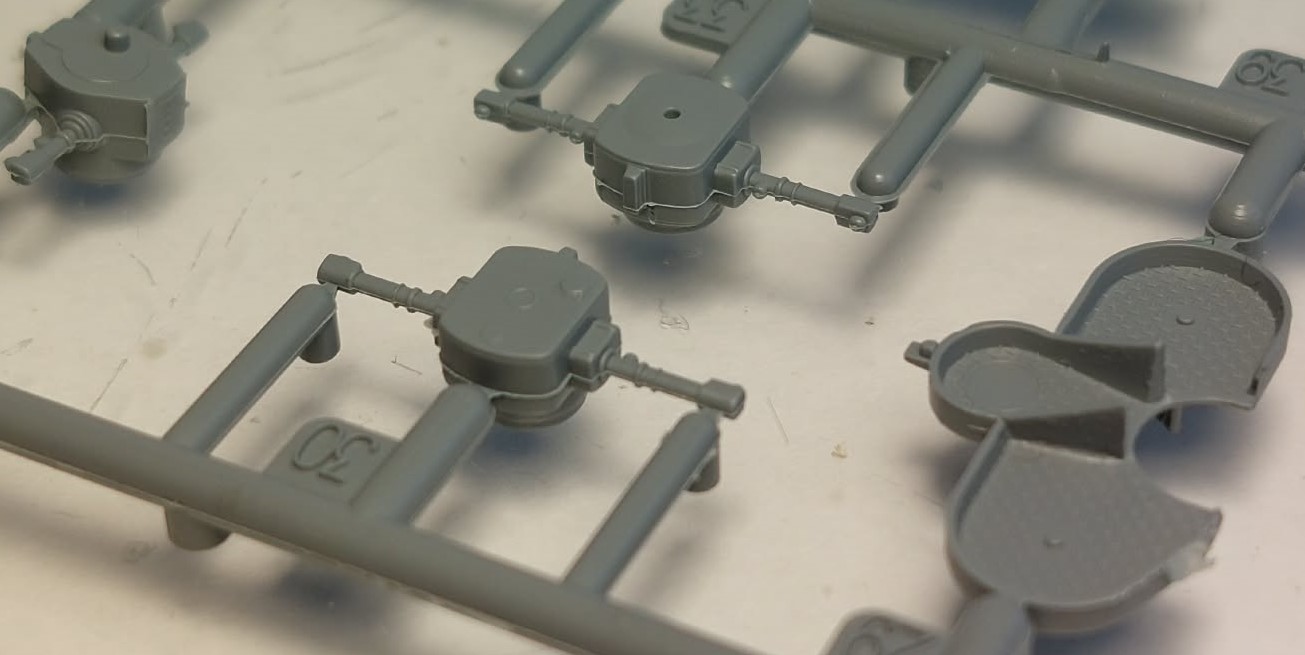 The superstructure components are among the parts that are not mounted on the sprue. The base of the superstructure consists of two pieces, which include the barbettes for gun turrets B and C.