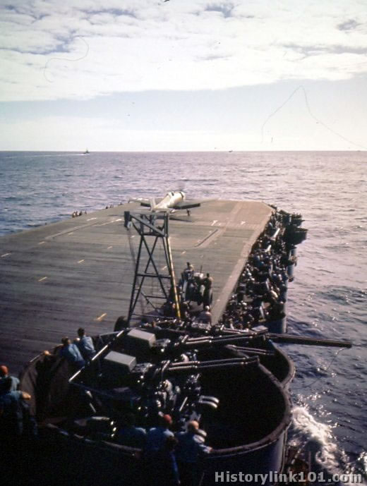 Also, the ESSEX Air Officer's used the angled flight line early on, even though the angled flight deck wouldn't be built for several years. It was actually an angled take off line. Flight dispatcher Officer Russel Volkema was the man that started doing this. The purpose was to allow the slip stream from the previous plane to disapate faster, allowing shorter wait times between launches. The Essex was able to launch and recover planes faster than other carriers until later in the war when a fleet officer, (actually Admiral John McCain - commander of task group 38). [Life and Death Aboard the USS ESSEX by Richard Sreb] came aboard to observe the methods used. Our officers attributed the eary success to the ability to respot planes faster, among other things.