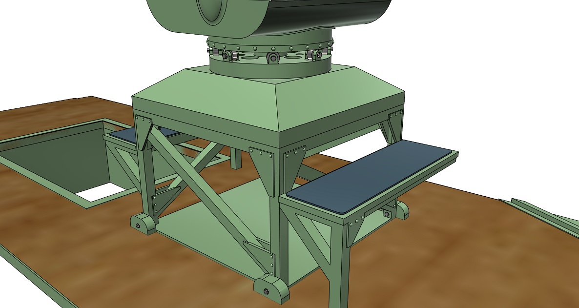 The bottom rendering shows the cannon control box presently in design. It is the boxy structure on the floor forward of the seat stand, between the rear-most cannon alignment adjustment controls. The model includes the raised lettering, safety switches and electrical cabling shown clearly in the rendering which didn't photograph well on the model.