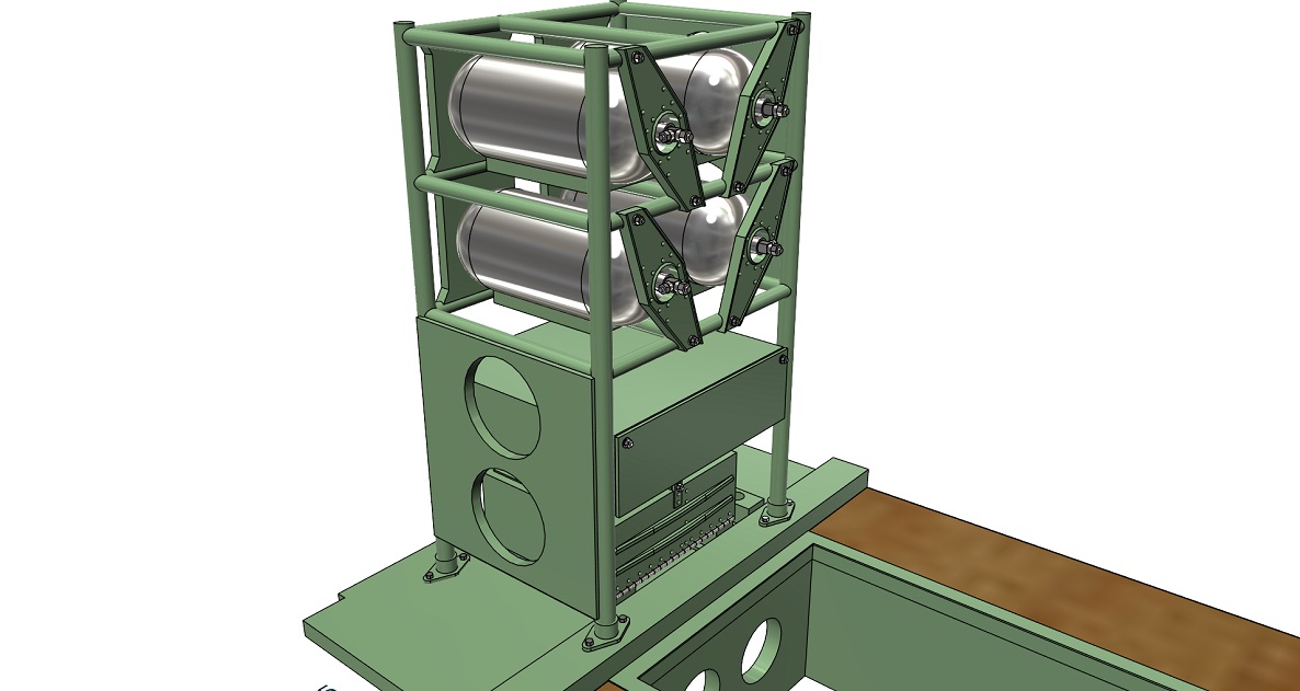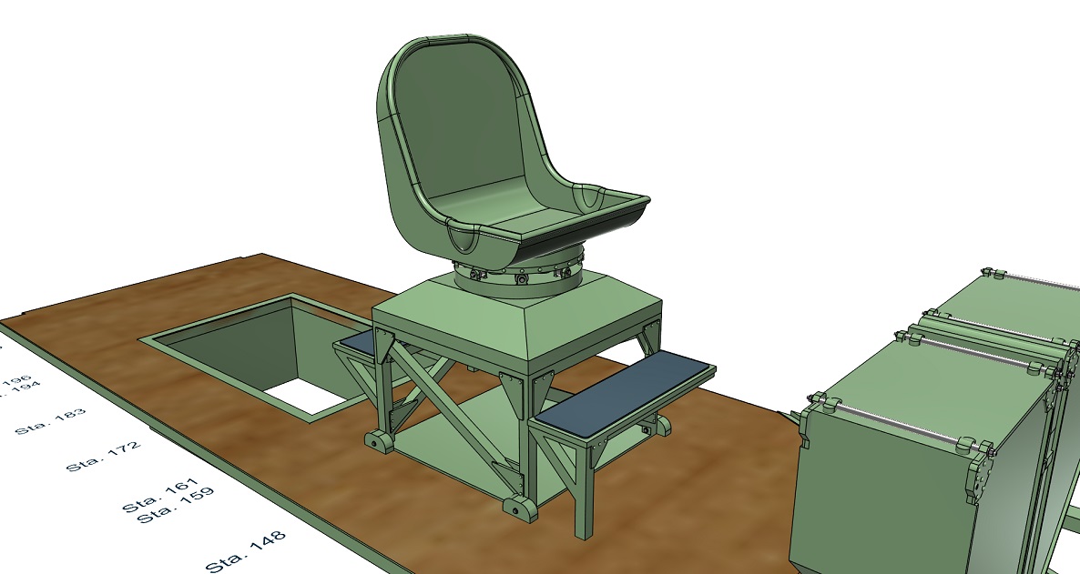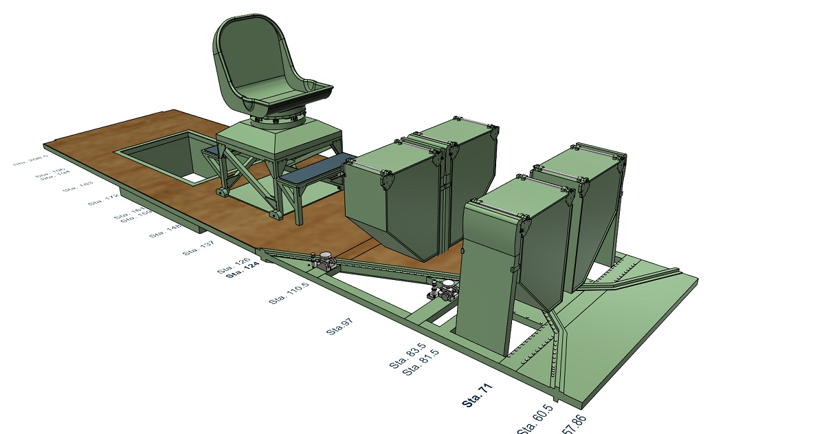 The bottom rendering shows the cannon control box presently in design. It is the boxy structure on the floor forward of the seat stand, between the rear-most cannon alignment adjustment controls. The model includes the raised lettering, safety switches and electrical cabling shown clearly in the rendering which didn't photograph well on the model.