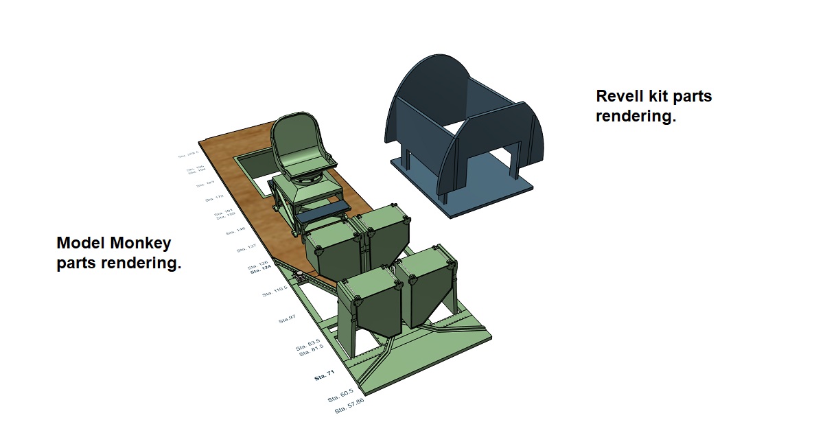 The next-to-bottom photo shows how the station fits with the cockpit and intra-spar equipment bay (already for sale in two configurations). The models fit the Revell kit better than shown in the photo; gravity was working against me when taking the picture so the models are laying slightly higher than they will be when glued into the fuselage halves.