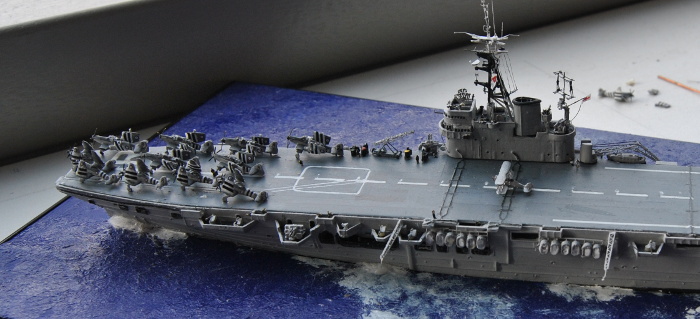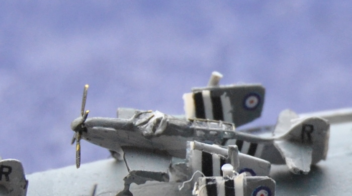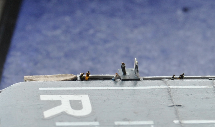 And I did the painting, dealing and weathering of the flight deck in one session. As I am thinking of doing another landing scene most effort was spent on the port side. As a number of reviewers have alreading pointed out you need two decal sets to get the catapults right.
