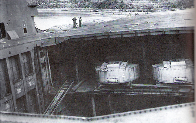 I think it was blown overboard, instead of collapsing down into the hangar. In this photo, a piece is still hanging from the port aft corner of the hole in the flight deck, upside down with its' support beam structure upwards (ignore the circles and numbers):J. Soca wrote:On the actual picture i wonder what happened to the missing piece of flight deck. Most likely slid into the sea but such big chunk of flight deck should still be visible on the shot and i don see it.