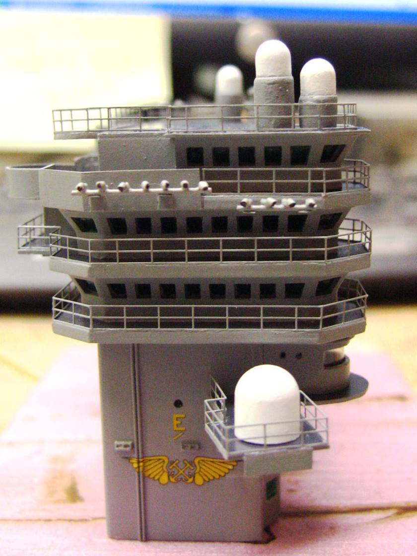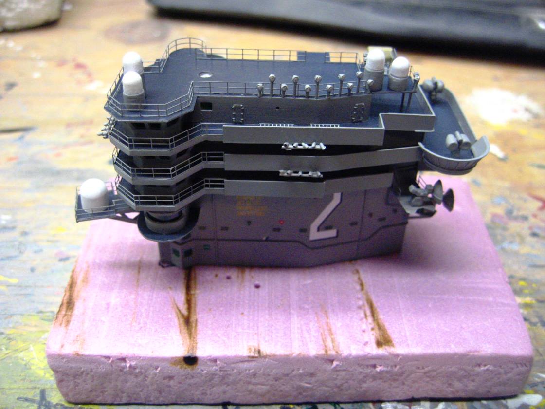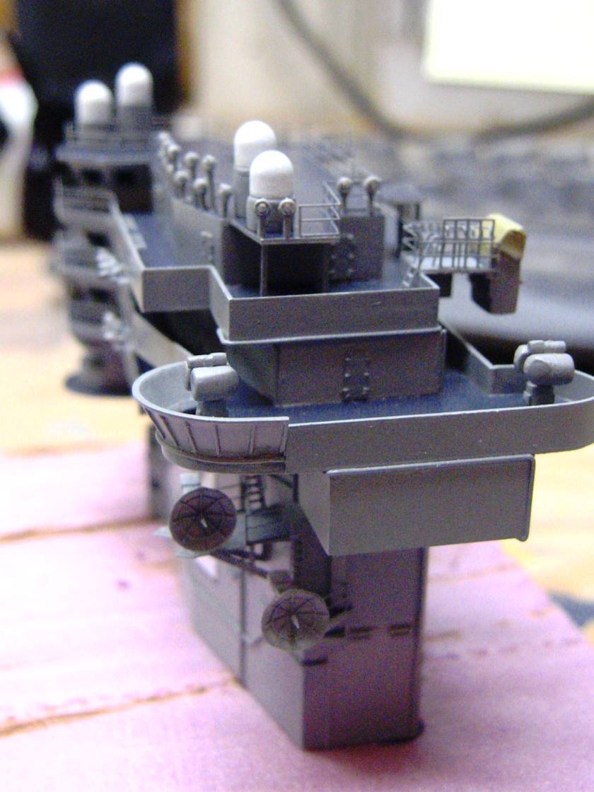 The island has started to get all of it's detail parts, with scratchbuilt clusters of spotlights (that look much better in person, but look like crap in these pictrues). It would figure that with all the stacomm domes I have made from scratch and then resin cast, that the ones on Lincoln are yet different still, so I had to go and make new ones from scratch.