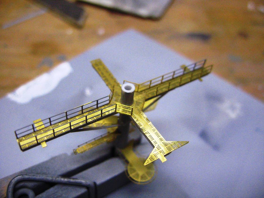 So last night I picked up right where I left off, which was on the main mast. I decided I was not happy with my PE work, especially on the rails, so I broke the whole thing down and started over. It appears that I never posted or took pictures of the original mast for comparison, but here is version 2.0. Not quite done, but I am happy with how it looks now. What I have here is a combo of kitbashing, scratch, and some unaltered PE parts.