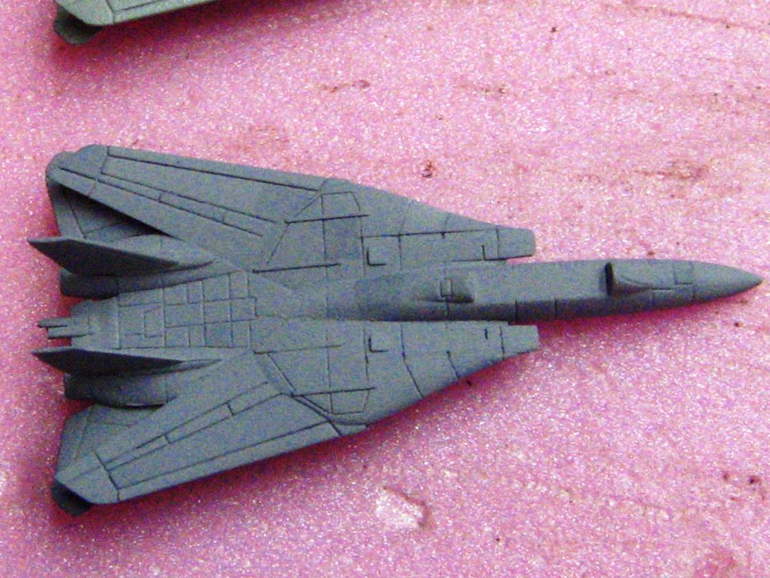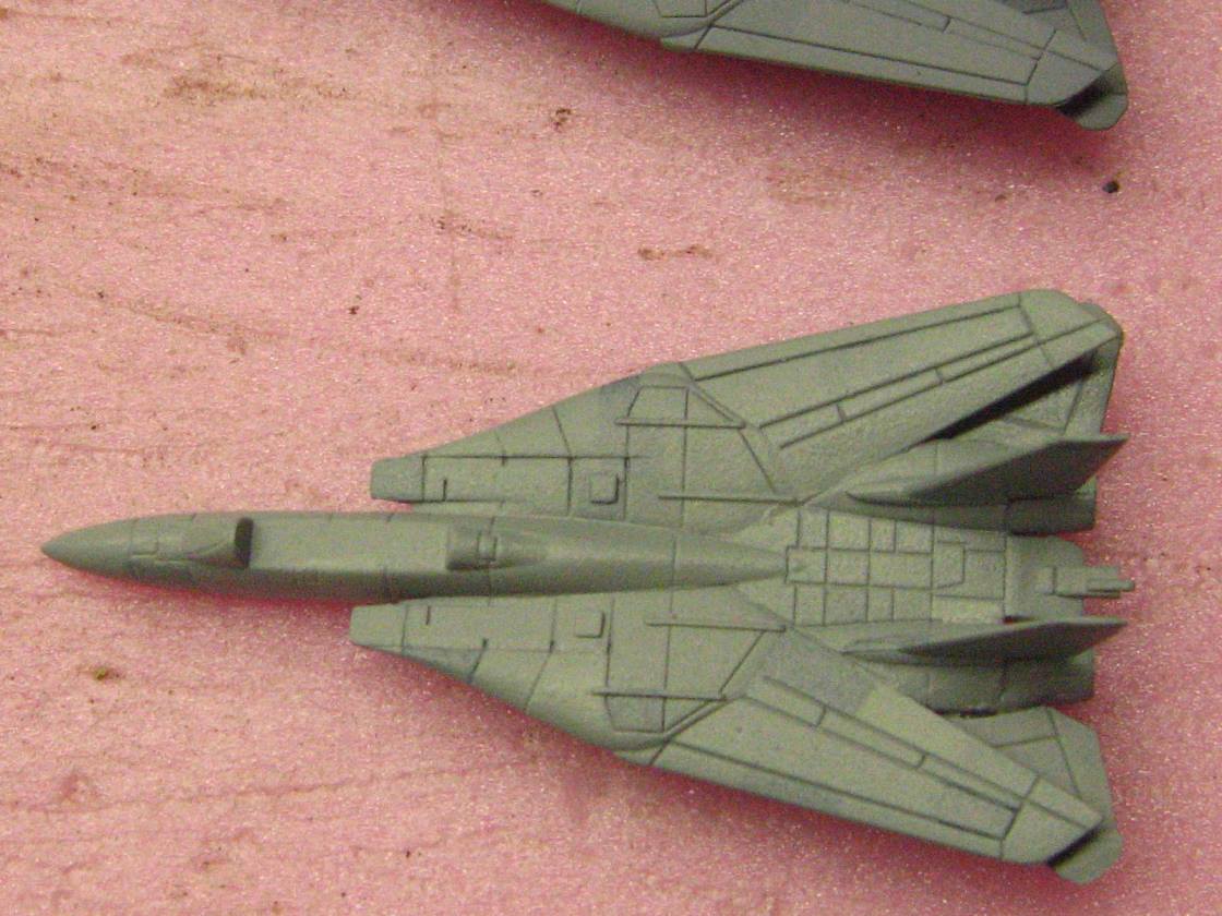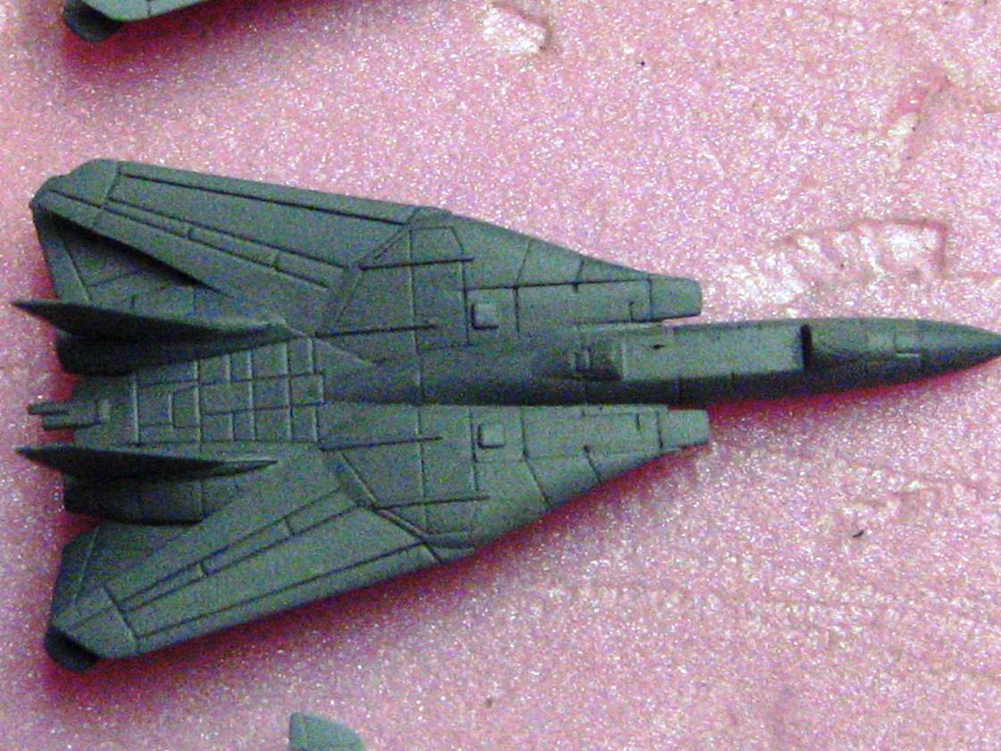 Anyways, the results of my pre-shading of aircraft panels are in, and I dig it! The pictures are crap, I was tired and did not realize just how bad the lighting was, but you can get the general idea. As with all my CVN airwings, I use numerous shades of grey, replicating the vastly varying shades of the supposedly same color that you will see throughout a carrier's aircraft.