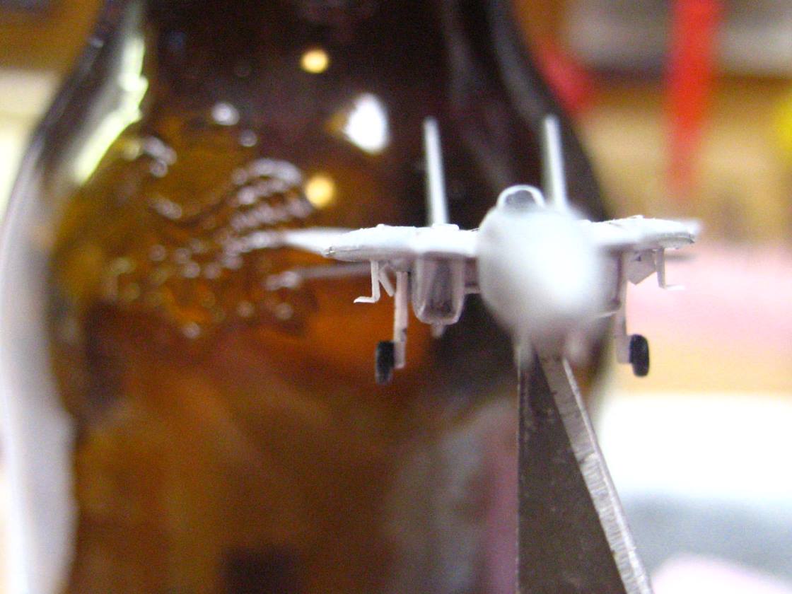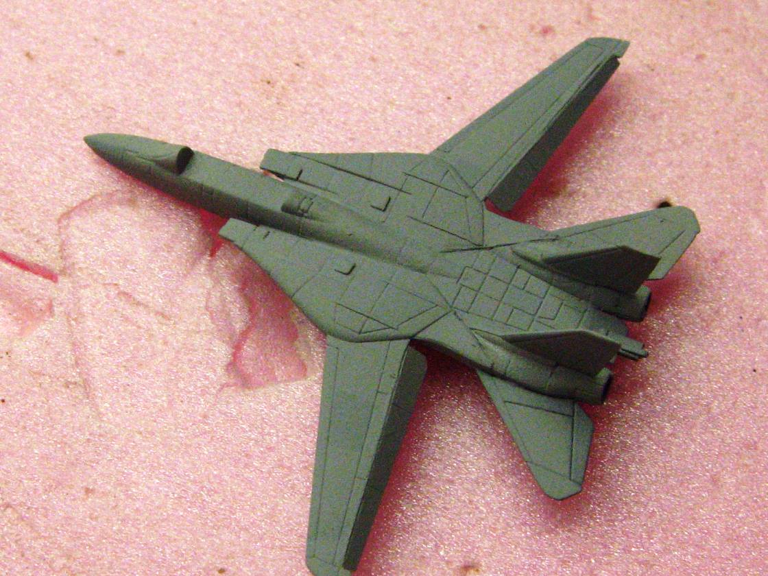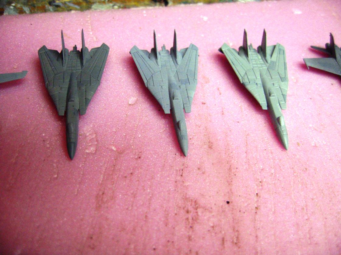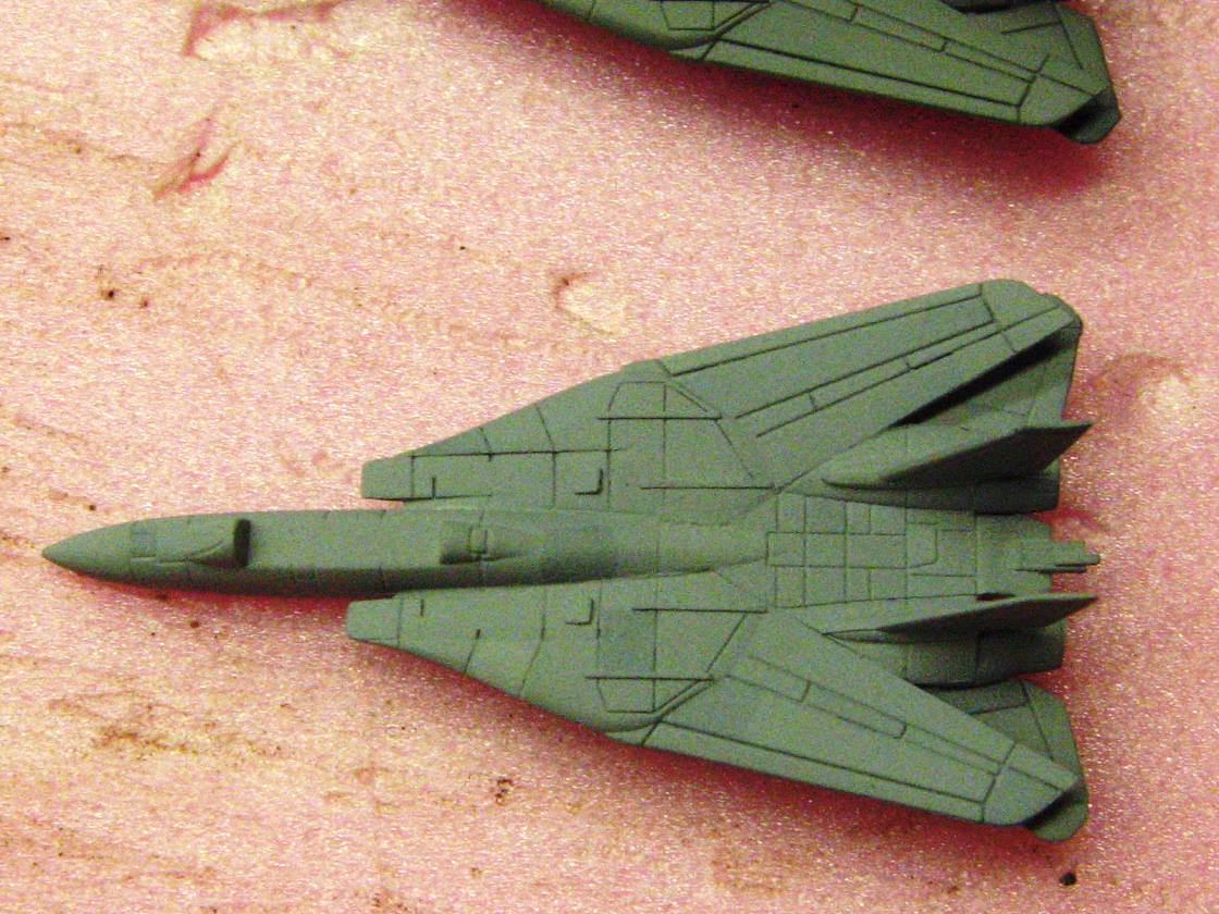 Anyways, the results of my pre-shading of aircraft panels are in, and I dig it! The pictures are crap, I was tired and did not realize just how bad the lighting was, but you can get the general idea. As with all my CVN airwings, I use numerous shades of grey, replicating the vastly varying shades of the supposedly same color that you will see throughout a carrier's aircraft.