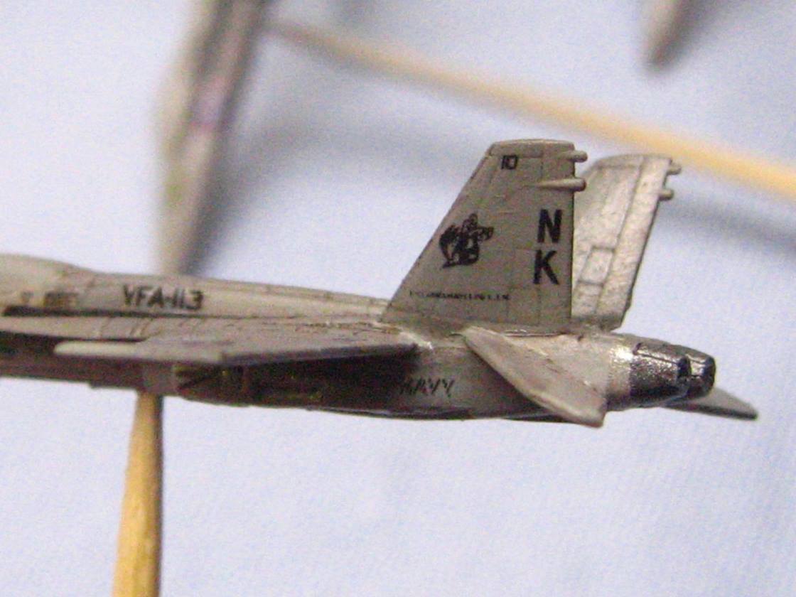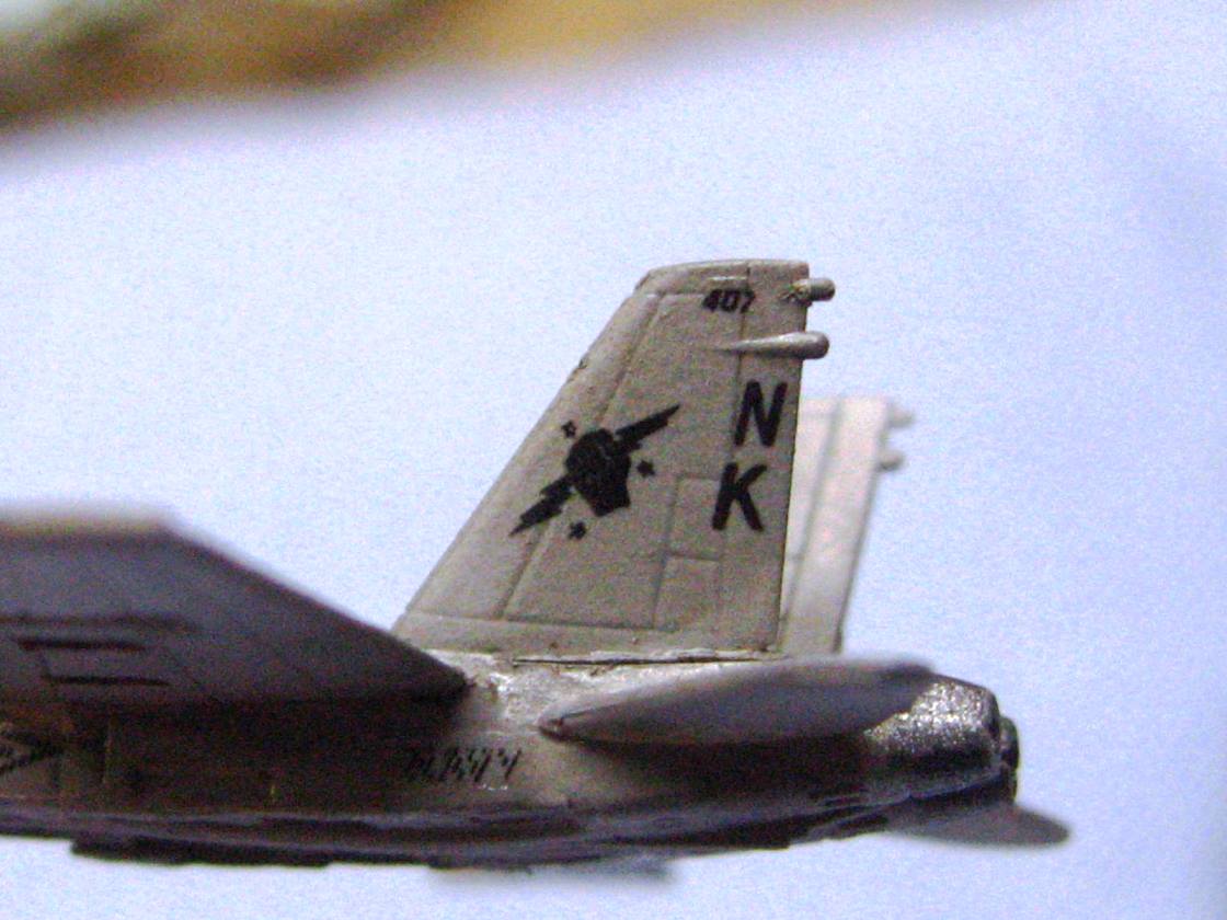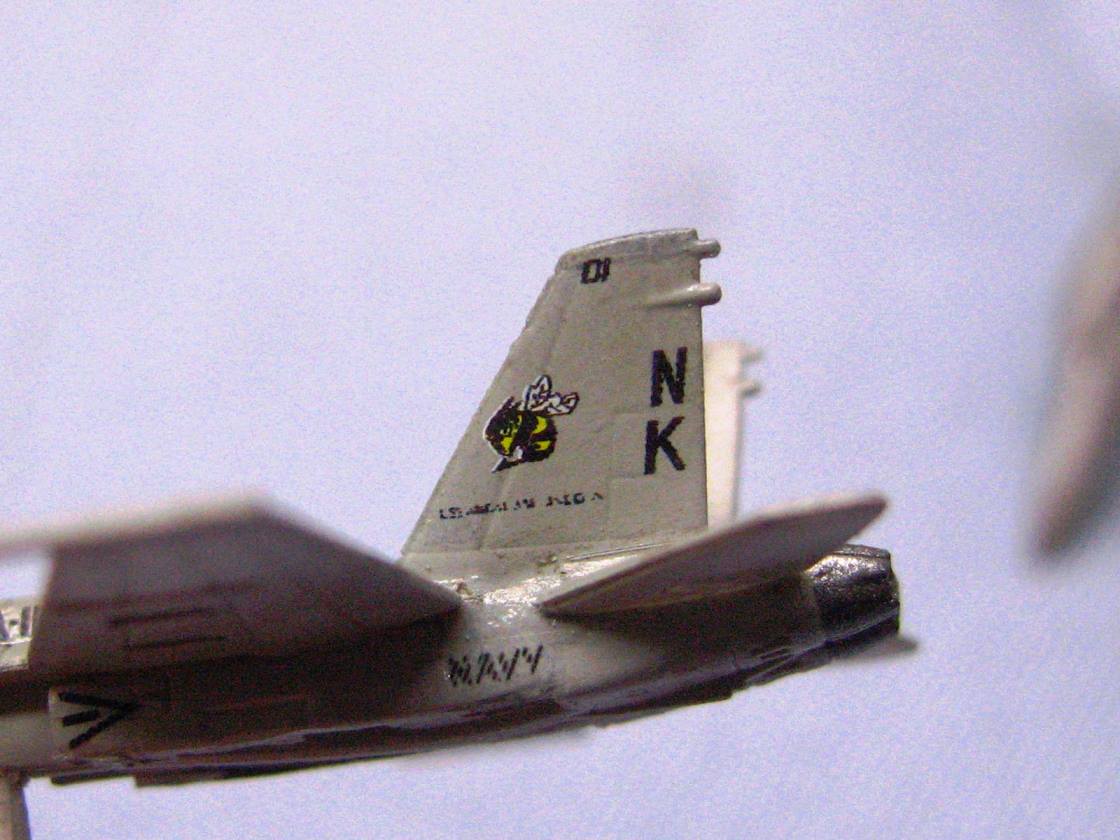 I actually timed myself on decaling one of the hornets. With trimming the clear film off of each decal, then cutting them out and applying them, it took me 18 minutes to do one bird. Now I realize why sometimes it seems I get so little done at the bench. That means that the airwing I did on Reagan took nearly 24 hours just with decals!