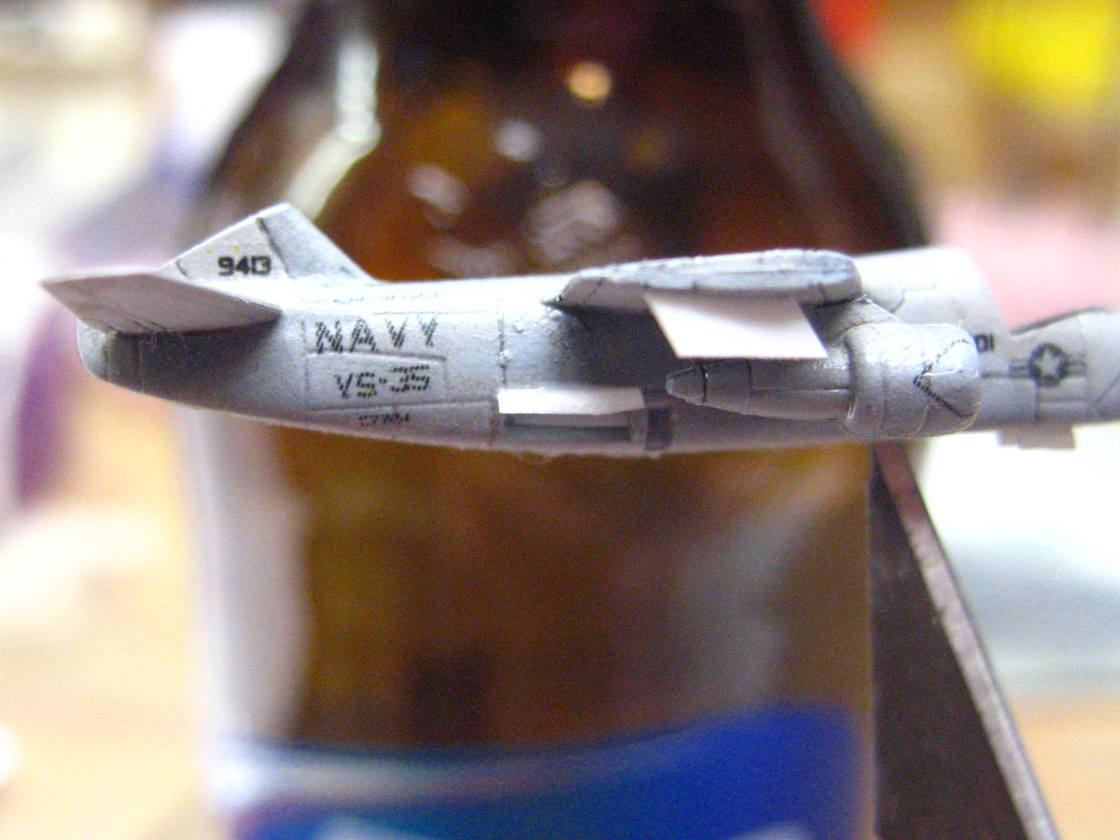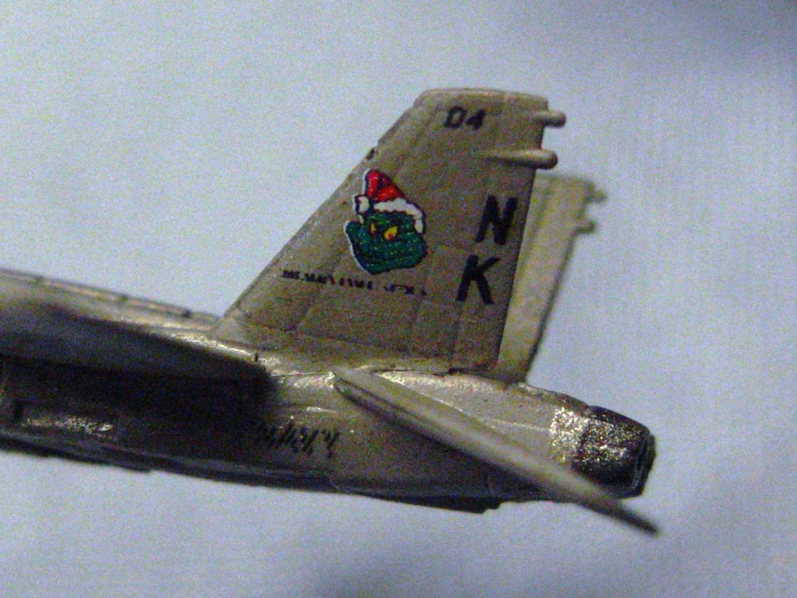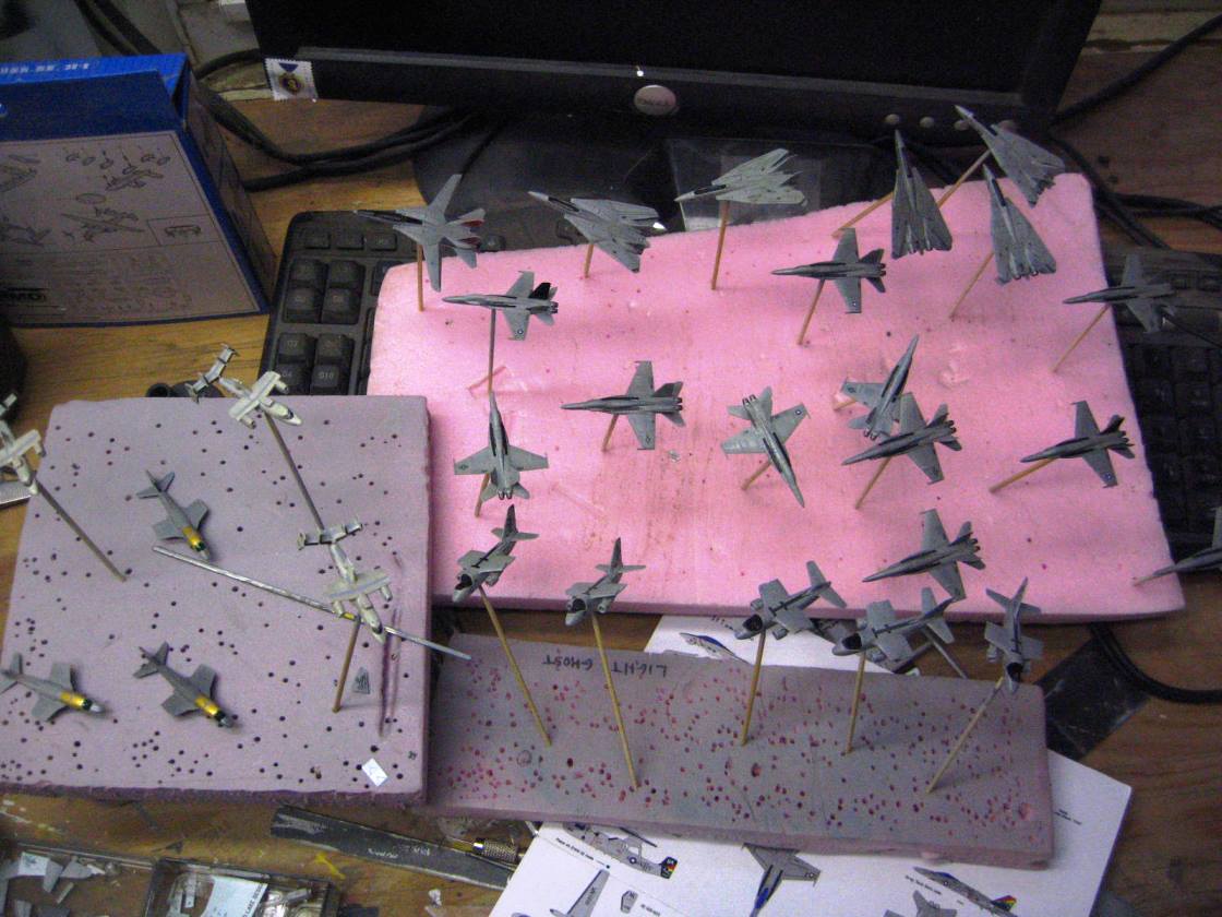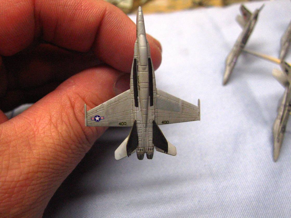 I actually timed myself on decaling one of the hornets. With trimming the clear film off of each decal, then cutting them out and applying them, it took me 18 minutes to do one bird. Now I realize why sometimes it seems I get so little done at the bench. That means that the airwing I did on Reagan took nearly 24 hours just with decals!