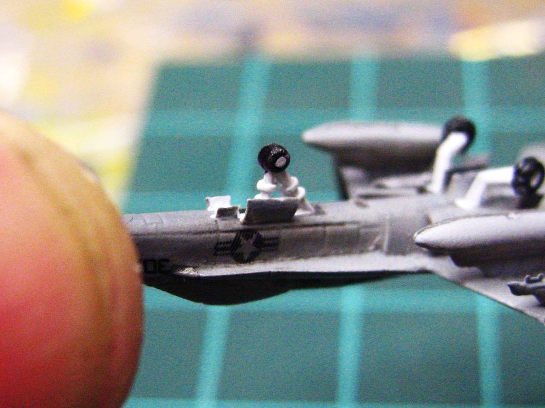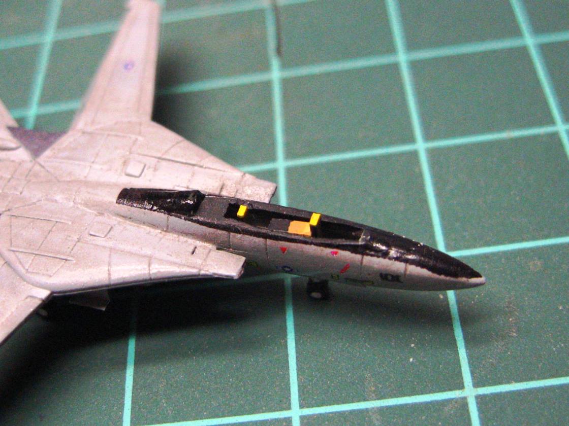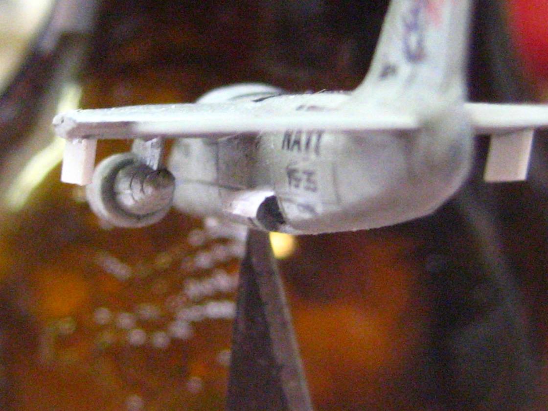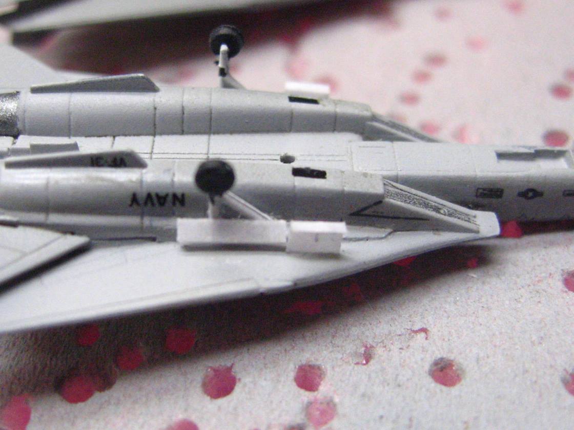In this scale, I find that painting perfectly straight de-icing lines on the E-2s and C-2s to be nearly impossible, so I now use spare black decaling stripes to ensure straight lines, looks much sharper.