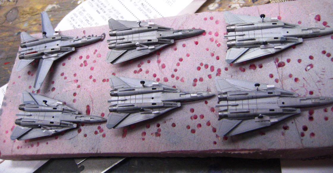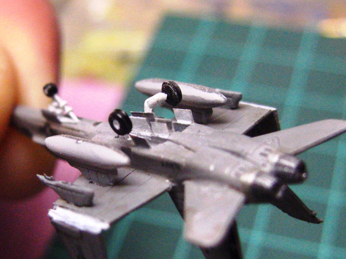 All of the hornets now have their gear doors, these were the most time consuming, as each has 9 friggin doors added to them! The airwing also started getting armed up, the missiles are from shapeways and required a ton of cleanup, and the bombs are from GHQ, also requiring a lot of work to clean them up.