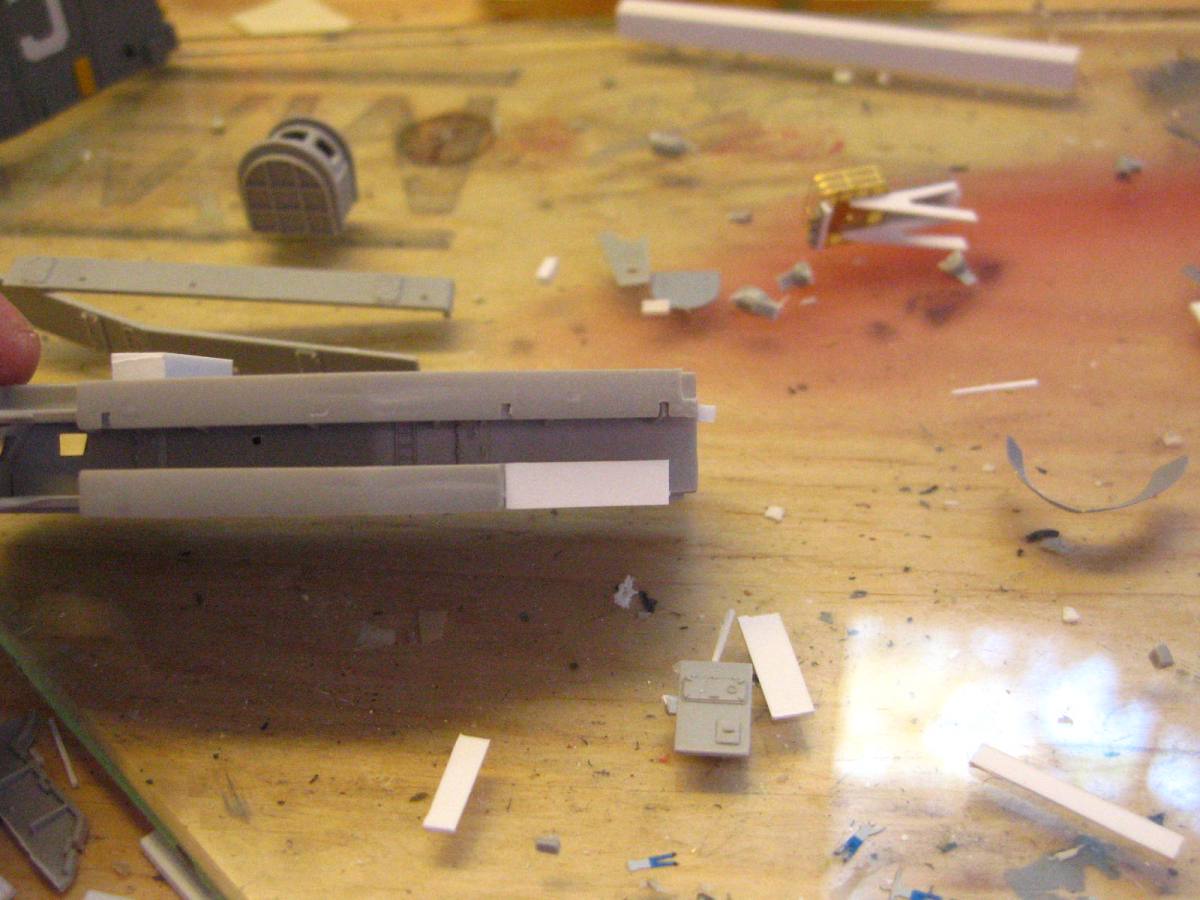 Some surgery needs to be done to the rear of the island before you start scratchbuilding the additions, you need to remove a section of the deck on the 0-2 level, and add some catwalk and bulkhead to the 0-1 level.