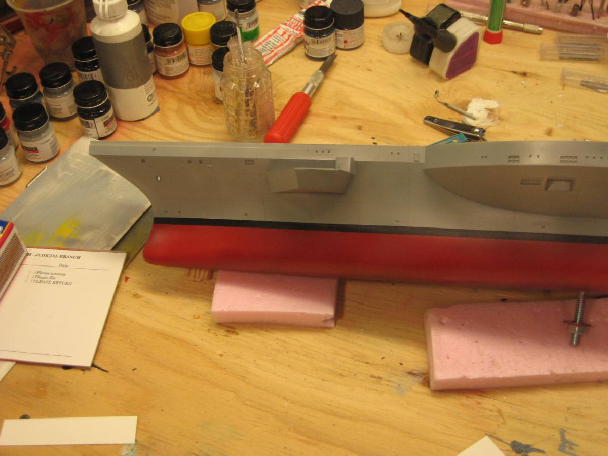 I did everything the same as I always do: I washed the hull and rinsed and dried it thouroughly. Then I lightly sanded the whole thing, primed and let dry for 24 hours. Then sprayed the grey, balck, and red, letting each dry for 24 hours before the next color. Then I coated it with 2 coats of future, with a day between each coat. I then used Tamiya tape to get the plating lines straight, but when I removed the tape, a ton of paint and primer came off with it right down to the bare plastic!!! I have no clue what the problem could be, as I am using the same paints and primers on other projects right now, with now issues at all. All I can think is that it must be an issue with the actual plastic in this particular kit ( I had no issues with the other 2 Nimitz kits I did before). So if anyone has any suggestions here, please feel free to speak up!