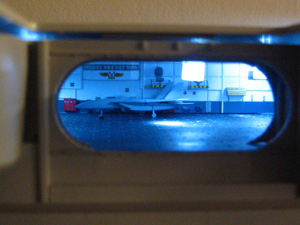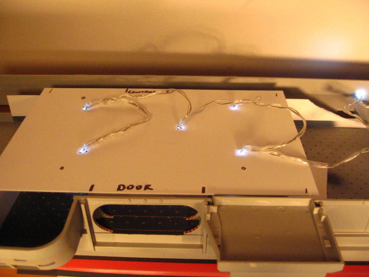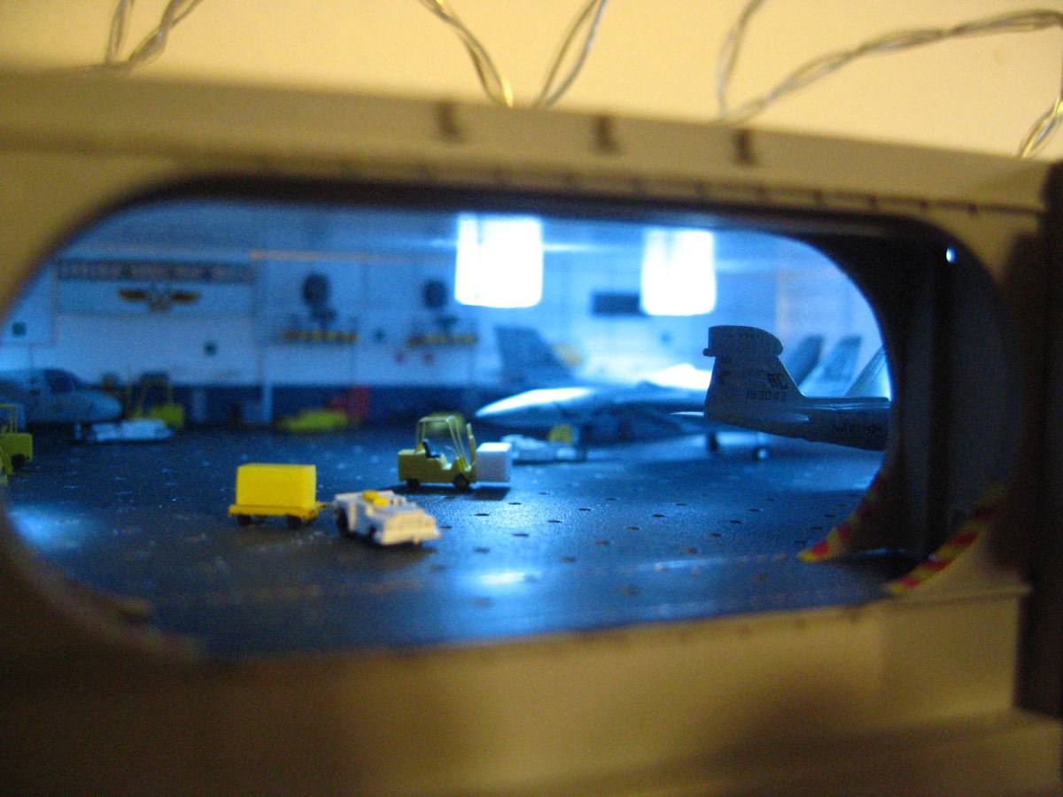 LED lighting test fitted, I am going to trim down the "boxes" around the bulbs a little more. THe boxes are not accurate, but do the job of hiding the bulbs. There is just not a lot of room to work with between the roof of the hangar and the underside of the flight deck, so the bulbs need to portrude into the hangar farther than I would like, but the result is still impressive.