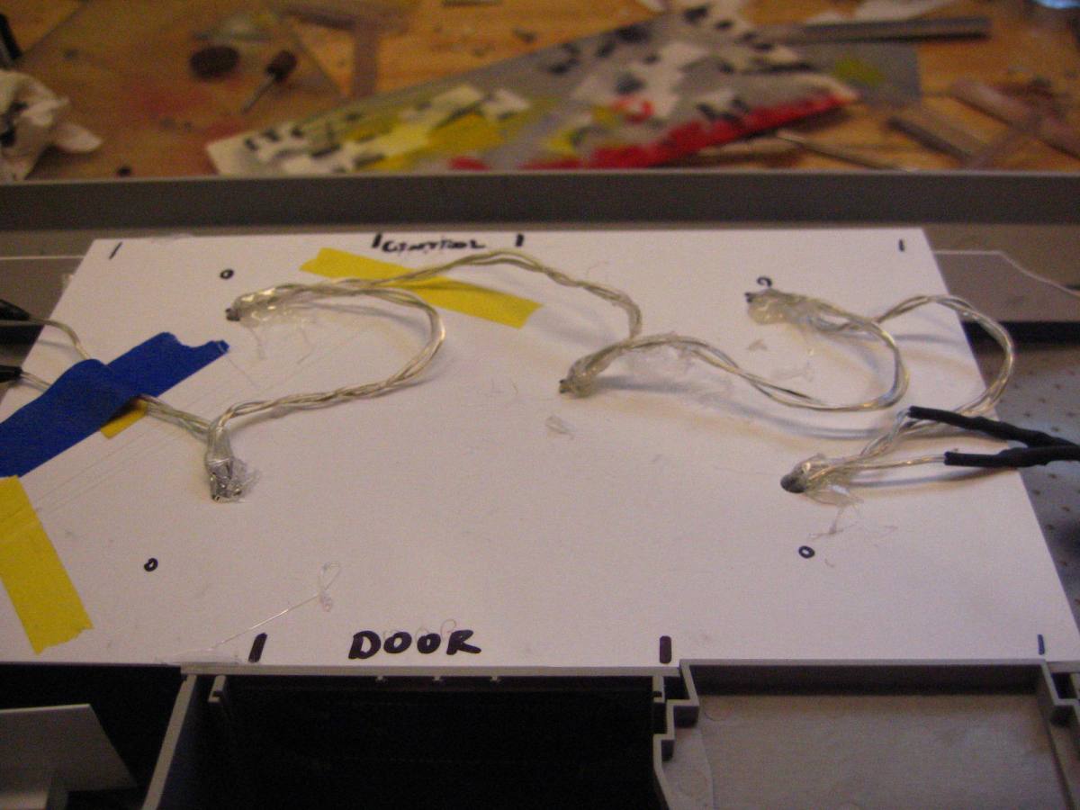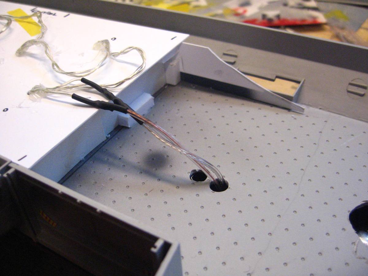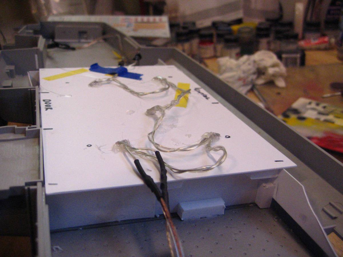 Anyways, as for the routing of the LED's here are some shots. Since I only did the one section of hangar, I removed a bunch of the lights from the string. I have one left that will be used to illuminate the fiber optics later on. spliced on a longer length of wire to connect the lights to the battery pack, run the wire out the bottom of the hull, then eventuall through the keel block and rout a channel in the underside of the wooden base. I connect it to the battery pack which I keep on the outside of the case, so the top of the case never has to be removed to change batteries or something, lessening the chance of damaging the model.