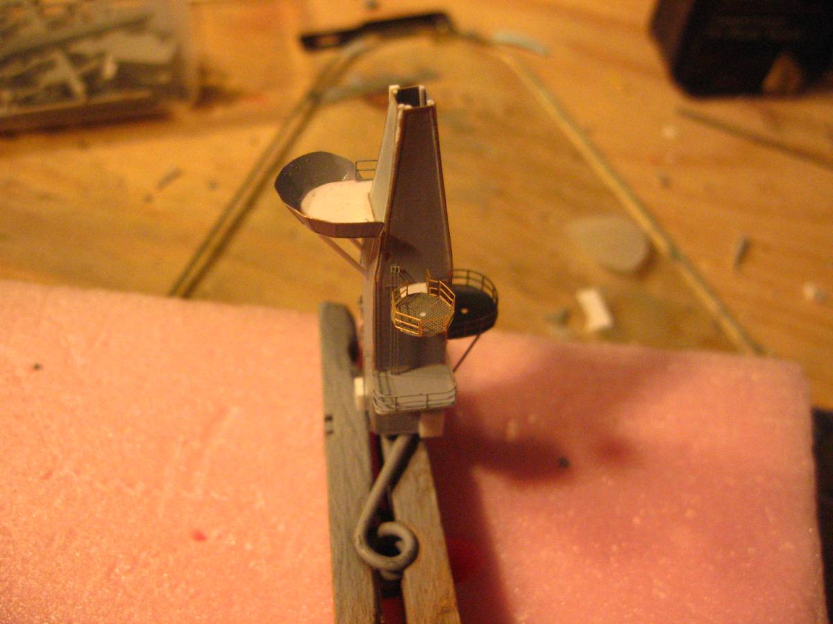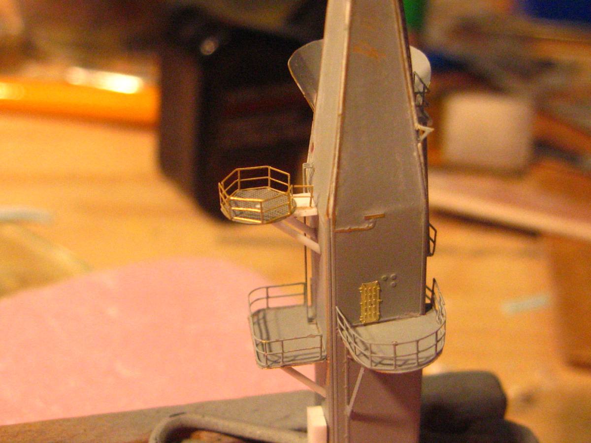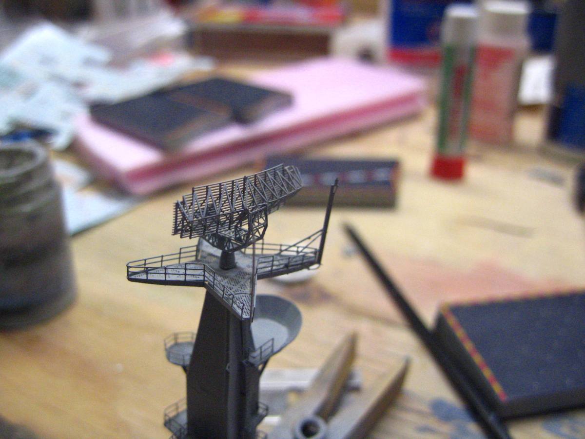 The aft radar mast was a project in itself. It is a combo of WEM, GMM, and Scratch. Each of the brass sets has good points and bad points, so I took the best from each, then added some bits of styrene to make it more accurate.