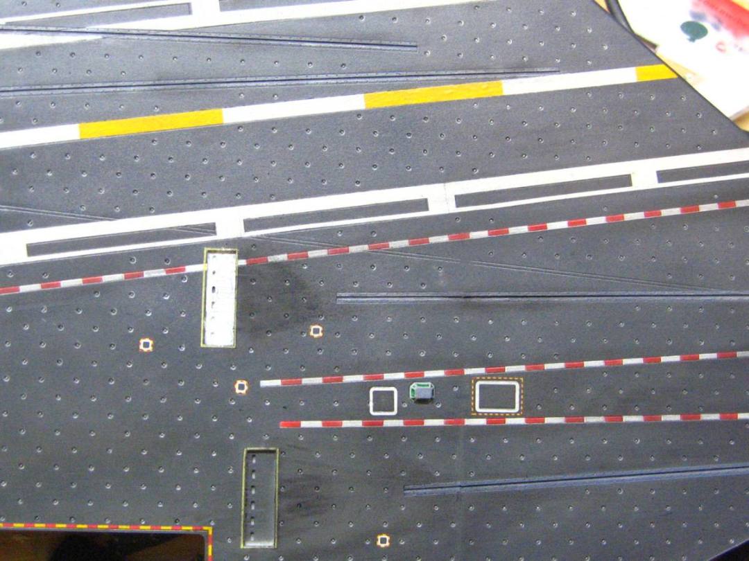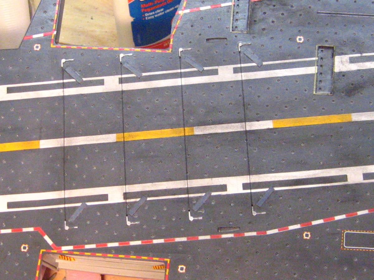 As a request of the commission, I have lightly weathered the flight deck. He wants the deck to look as it did when she came out of the yard for refit and had undergone "CQ's" with the airwing. I have a little more touch up and smaller weathereing areas to do, but it is nearly done. I am going to add just a little more wear and tear to the area between the 4 wires, but that should be the last of it. I have not overcoated it with flat yet, so the finished product will be a little less weathered than you see in the pictures, since the pressure form the airbrush will blow away some of the pastel powder. I used a combination of artist's oil paints thinned way down to coat the whole deck to take a little of the "brightness" away, then the pastel powder to more heavily weather specific areas.